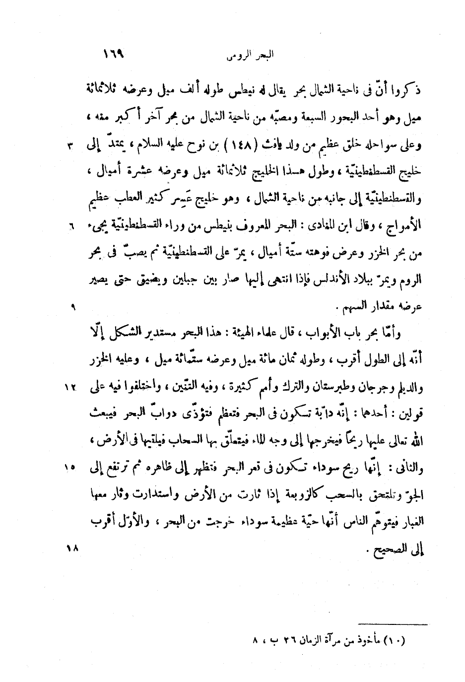 وأمّا بحر باب الأبواب، (1) قال علماء الهيئة: هذا البحر مستدير الشكل إلاّ أنّه إلى الطول أقرب، وطوله ثمان مائة ميل وعرضه ستّمائة ميل، وعليه الخزر والديلم وجرجان وطبرستان والترك وأمم كثيرة، وفيه التنّين، واختلفوا فيه على قولين: أحدهما: إنّه دابّة تكون فى البحر فتعظم فتؤذّى دوابّ البحر فيبعث الله تعالى عليها ريحا فيخرجها إلى وجه الماء فيتعلّق بها السحاب فيلقيها فى الأرض، والثانى: إنّها ريح سوداء تكون فى قعر البحر فتظهر إلى ظاهره ثم ترتفع إلى الجوّ وتلتحق بالسحب كالزوبعة إذا ثارت من الأرض واستدارت وثار معها الغبار فيتوهّم الناس أنّها حيّة عظيمة سوداء خرجت من البحر، والأوّل أقرب إلى الصحيح.
