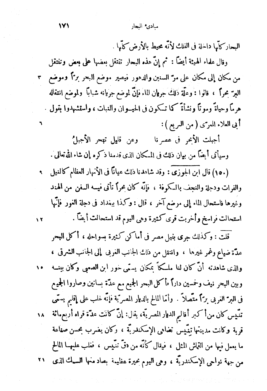 وقال علماء الهيئة أيضا: ثم إنّ هذه البحار تنتقل بعضها على بعض وتنتقل من مكان إلى مكان على مرّ السنين والدهور فيصير موضع البحر برّا وموضع البرّ بحرا، قالوا: وعلّة ذلك جريان الماء فإنّ لموضع جريانه شبابا ولموضع انتقاله هرما وحياة وموتا ونشأة كما تكون فى الحيوان والنبات، واستشهدوا بقول أبى العلاء المعرّى (من الربع):