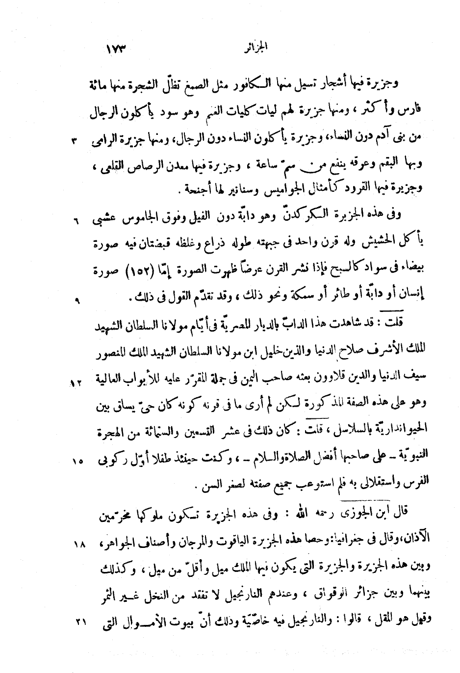 وفى هذه الجزيرة الكركدنّ وهو دابّة دون الفيل وفوق الجاموس عشبى يأكل الحشيش وله قرن واحد فى جبهته طوله ذراع وغلظه قبضتان فيه صورة بيضاء فى سواد كالسبح فإذا نشر القرن عرضا ظهرت الصورة إمّا (152) صورة إنسان أو دابّة أو طائر أو سمكة ونحو ذلك، وقد تقدّم القول فى ذلك.