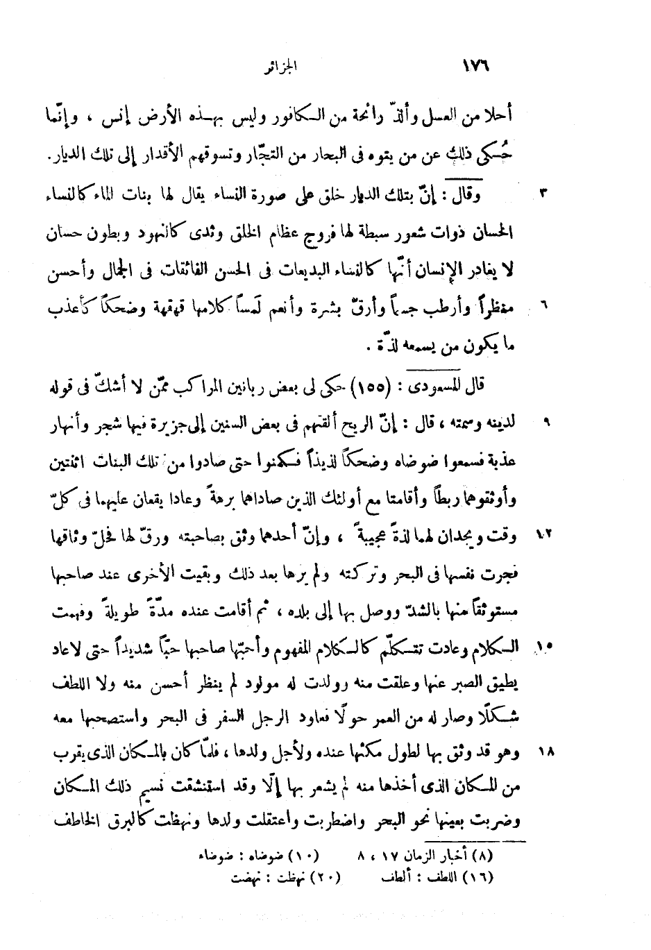 قال المسعودى: (155) (1) حكى لى بعض ربانين المراكب ممّن لا أشكّ فى قوله لدينه وسمته، قال: إنّ الريح ألقهم فى بعض السنين إلى جزيرة فيها شجر وأنهار عذبة فسمعوا ضوضاه (2) وضحكا لذيذا فكمنوا حتى صادوا من تلك البنات اثنتين وأوثقوهما ربطا وأقامتا مع أولئك الذين صاداهما برهة وعادا يقعان عليهما فى كلّ وقت ويجدان لهما لذة عجيبة، وإنّ أحدهما وثق بصاحبته ورقّ لها فحلّ وثاقها فجرت نفسها فى البحر وتركته ولم يرها بعد ذلك وبقيت الأخرى عند صاحبها مستوثقا منها بالشدّ ووصل بها إلى بلده، ثم أقامت عنده مدّة طويلد وفهمت الكلام وعادت تتكلّم كالكلام المفهوم وأحبّها صاحبها حبّا شديدا حتى لا عاد يطيق الصبر عنها وعلقت منه وولدت له مولود لم ينظر أحسن منه ولا اللطف (3) شكلا وصار له من العمر حولا فعاود الرجل السفر فى البحر واستصحبها معه وهو قد وثق بها لطول مكثها عنده ولأجل ولدها، فلمّا كان بالمكان الذى يقرب من المكان الذى أخذها منه لم يشعر بها إلاّ وقد استنشقت نسيم ذلك المكان وضربت بعينها نحو البحر واضطربت واعتقلت ولدها ونهظت (4) كالبرق الخاطف