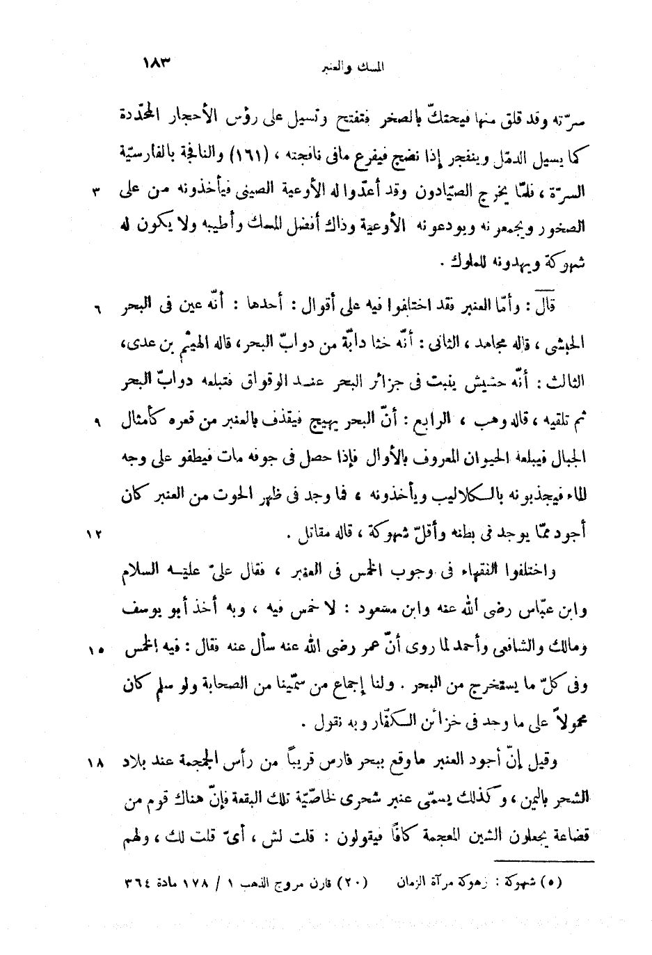 واختلفوا الفقهاء فى وجوب الخمس فى العنبر، فقال علىّ عليه السلام وابن عبّاس رضى الله عنه وابن مسعود: لا خمس فيه، وبه أخذ أبو يوسف ومالك والشافعى وأحمد لما روى أنّ عمر رضى الله عنه سأل عنه فقال: فيه الخمس وفى كلّ ما يستخرج من البحر. ولنا إجماع من سمّينا من الصحابة ولو سلم كان محمولا على ما وجد فى خزائن الكفّار وبه نقول.