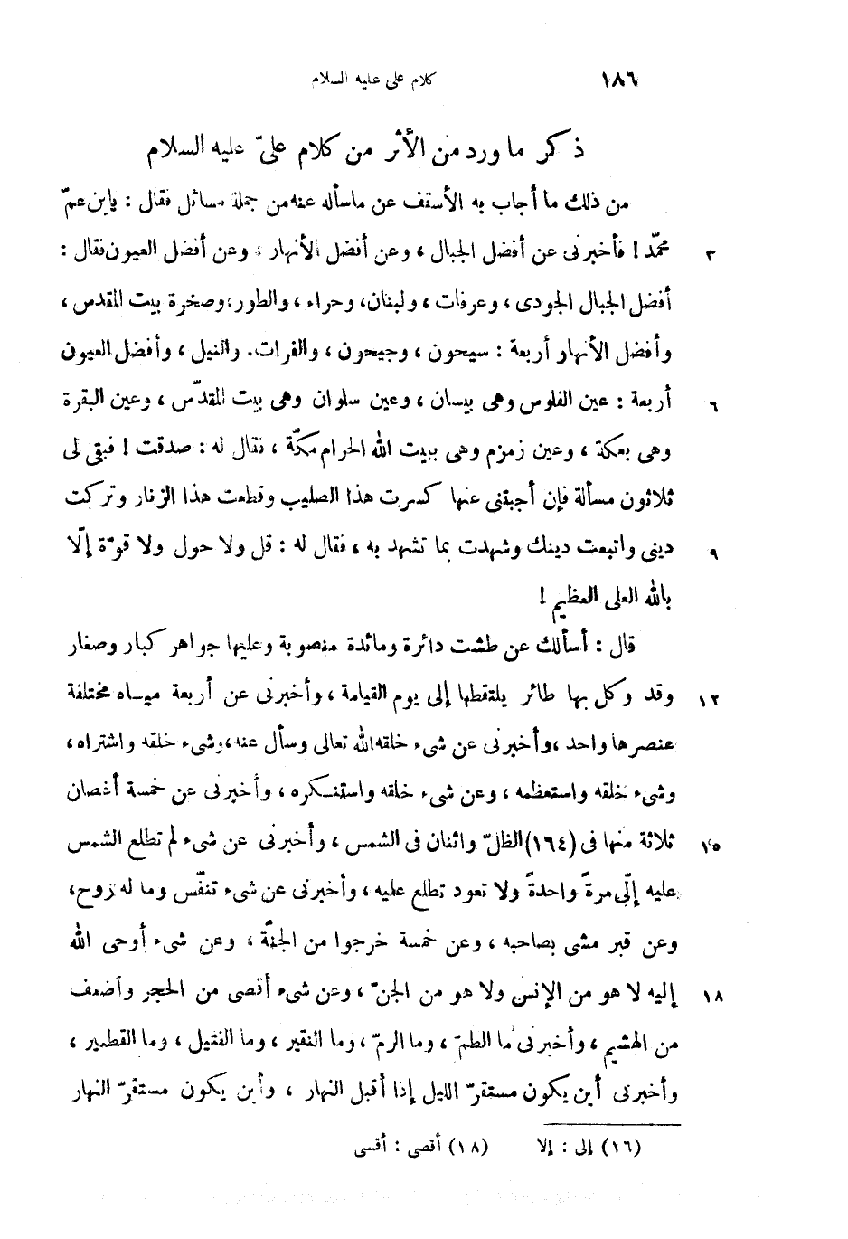أفضل الجبال الجودى، وعرفات، ولبنان، وحراء، والطور، وصخرة بيت المقدس، وأفضل الأنهار أربعة: سيحون، وجيحون، والفرات. والنيل، وأفضل العيون أربعة: عين الفلوس وهى بيسان، وعين سلوان وهى بيت المقدّس، وعين البقرة وهى بعكة، وعين زمزم وهى ببيت الله الحرام مكّة، فقال له: صدقت! فبقى لى ثلاثون مسألة فإن أجبتنى عنها كسرت هذا الصليب وقطعت هذا الزنار وتركت دينى واتبعت دينك وشهدت بما تشهد به، فقال له: قل ولا حول ولا قوّة إلاّ بالله العلى العظيم!
