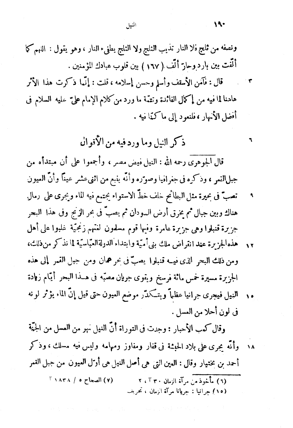 (1) قال الجوهرى رحمه الله: (2) النيل فيض مصر، وأجمعوا على أن مبتدأه من جبل القمر، وذكره فى جغرافيا وصوّره وأنّه ينبع من اثنى عشر عينا وأنّ العيون تصبّ فى بحيرة مثل البطائح خلف خطّ الاستواء يجتمع فيه الماء ويجرى على رمال هناك وبين جبال ثم يخرق أرض السودان ثم يصبّ فى بحر الزنج وفى هذا البحر جزيرة قنبلوا وهى جزيرة عامرة وفيها قوم مسلمون لغتهم زنجيّة غلبوا على أهل هذه الجزيرة عند انقراض ملك بنى أميّة وابتداء الدولة العبّاسيّة لما نذكر من ذلك، ومن ذلك البحر الذى فيه قنبلوا يصبّ فى بحر عمان ومن جبل القمر إلى هذه الجزيرة مسيرة خمس مائة فرسخ ويقوى جريان مصبّه فى هذا البحر أيّام زيادة النيل فيجرى جرانيا (3) عظيما ويتكدّر موضع العيون حتى قيل إنّ الماء يؤثر لونه فى لون أحلا من العسل.