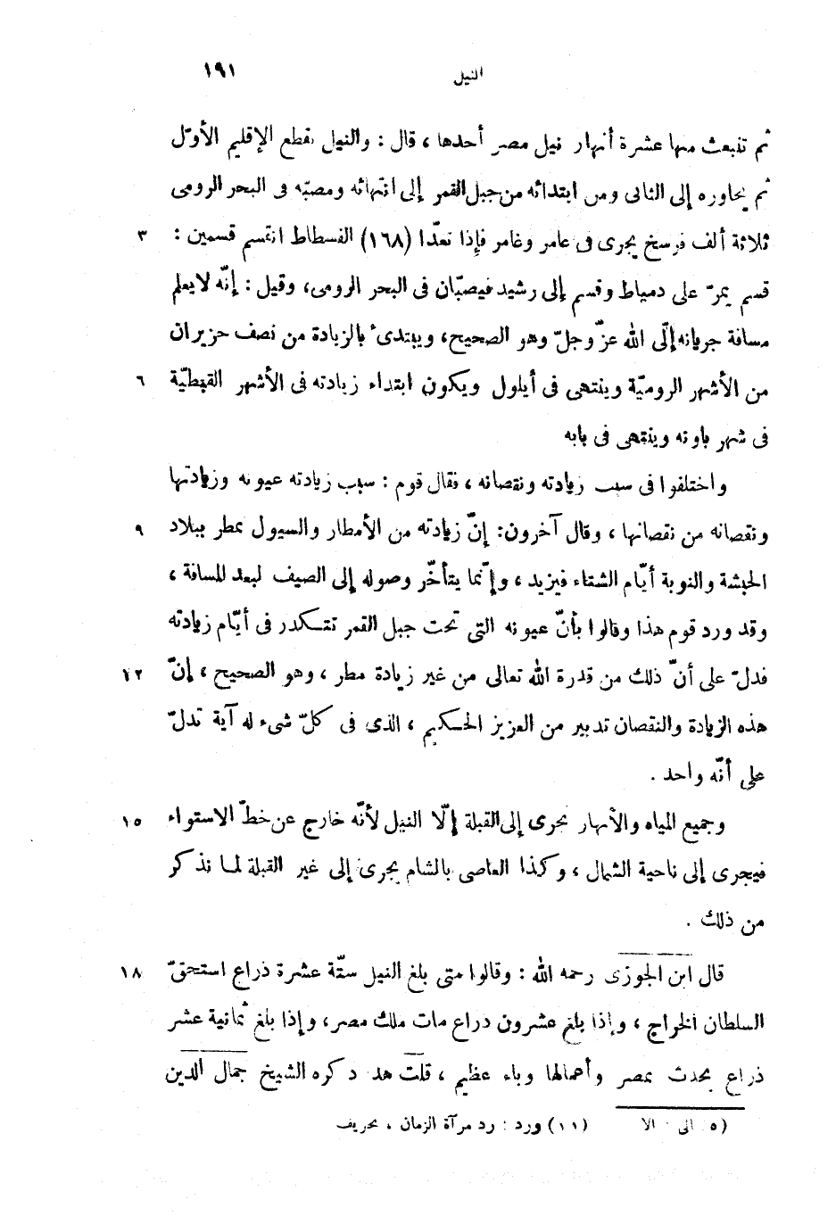 واختلفوا فى سبب زيادته ونقصانه، فقال قوم: سبب زيادته عيونه وزيادتها ونقصانها من نقصانها، وقال آخرون: إنّ زيادته من الأمطار والسيول تمطر ببلاد الحبشة والنوبة أيّام الشتاء فيزيد، وإنّما يتأخّر وصوله إلى الصيف لبعد المسافة، وقد ورد قوم هذا (2) وقالوا بأنّ عيونه التى تحت جبل القمر تتكدر فى أيّام زيادته فدلّ على أنّ ذلك من قدرة الله تعالى من غير زيادة مطر، وهو الصحيح، إنّ هذه الزيادة والنقصان تدبير من العزيز الحكيم، الذى فى كلّ شئ له آية تدلّ على أنّه واحد.