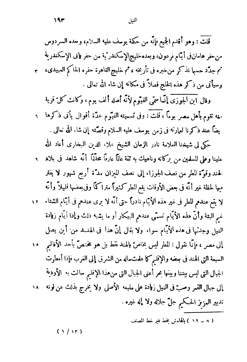 حكى (1) لى شيخنا العلامة نادر الزمان الشيخ علاء الدين البخارى أعاد الله علينا وعلى المسلمين من بركاته وناهيك به ثقة عالما عارفا محقّقا أنّه شاهد فى بلاد لهند وقوّة المطر من نصف الجوزاء إلى نصف الميزان مدّة أربع شهور لا يفتر فيها لحظة غير أنّه فى بعض الأوقات يقع المطر كثيرا متراكما وفى بعضها قليلا وأنّه لا يقع عندهم المطر فى غير هذه الأيّام نادرا حتى أنّه لا يرى عندهم فى أيّام الشتاء غيم البتة وأنّ هذه الأيّام تسمّى عندهم البيكار أو ما يشبه ذلك وإذا أيّام زيادة النيل وجدتها فى هذه الأيّام سواء ولا يقال إنّ هذا فى الهند من أين يصل إلى مصر، فإنّا نقول: المطر ليس بخاصّ بالهند فقط بل هو مختصّ بأحد الأقاليم السبعة التى الهند فى بعضه والإقليم كما علمت ما له من الشرق إلى الغرب فإذا أمطرت الجبال التى ليس بيننا وبينها بحرا أعنى الجبال التى من هذا الإقاليم سالت به الأدوية إلى جبال القمر وصبّ فى النيل زيادة على منبعه الأصلى ولا يخرج بذلك عن لونه تدبير العزيز الحكيم جلّ جلاله ولا إله غيره.