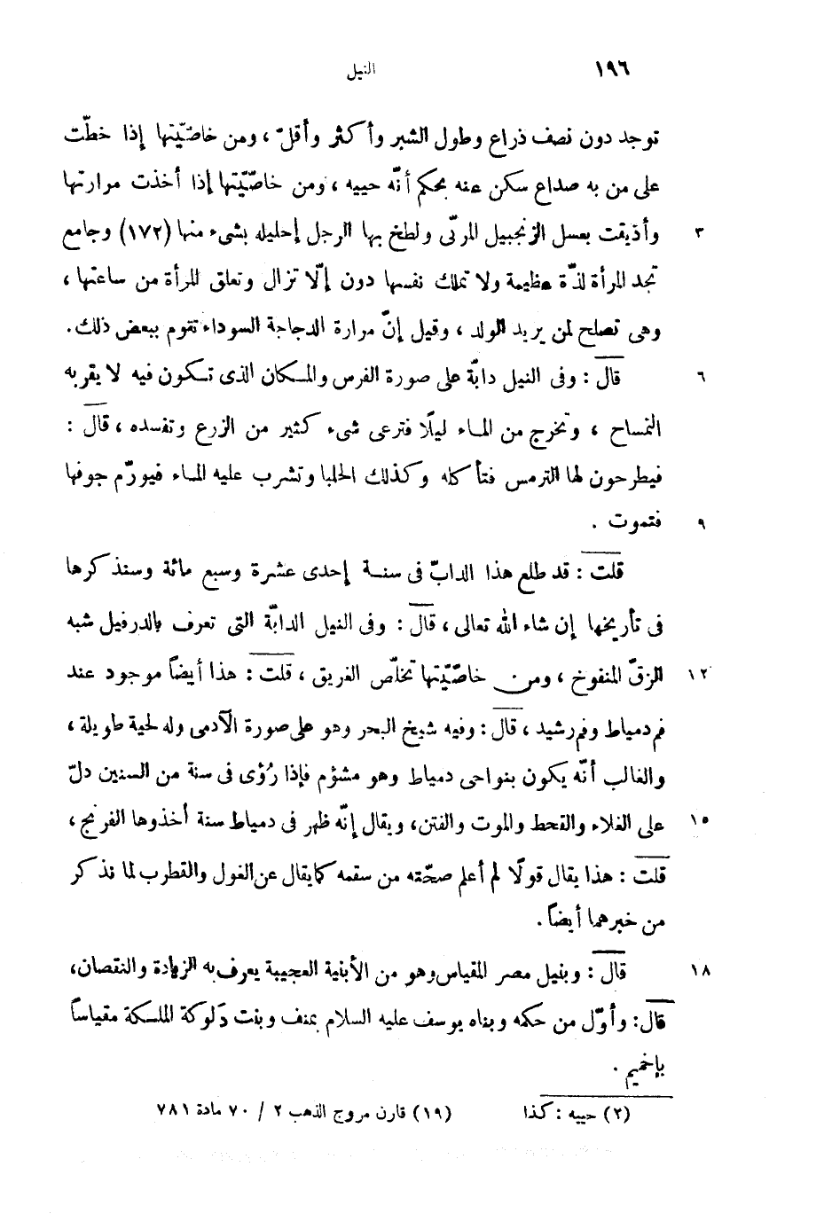 قال: (2) وبنيل مصر المقياس وهو من الأبنية العجيبة يعرف به الزيادة والنقصان، قال: وأوّل من حكمه وبناه يوسف عليه السلام بمنف وبنت دلوكة الملكة مقياس بإخميم.