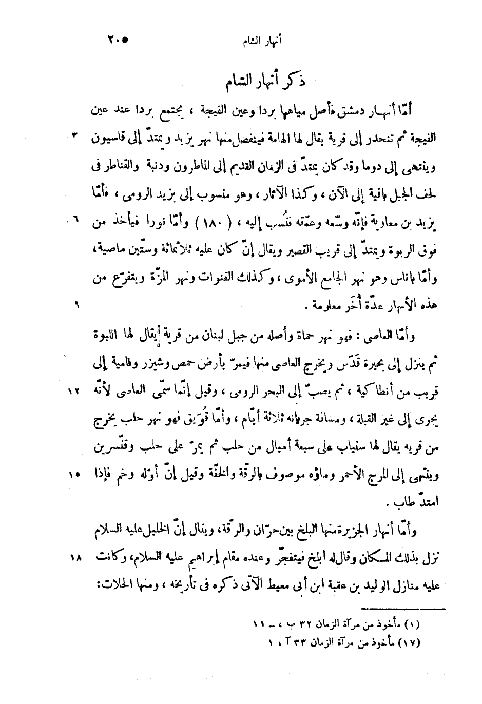 (1) أمّا أنهار دمشق فأصل مياهها بردا وعين الفيجة، يجتمع بردا عند عين الفيجة ثم تنحدر إلى قرية يقال لها الهامة فينفصل منها نهر يزيد ويمتدّ إلى قاسيون وينتهى إلى دوما وقد كان يمتدّ فى الزمان القديم إلى الماطرون ودنبة والقناطر فى لحف الجبل باقية إلى الآن، وكذا الآثار، وهو منسوب إلى يزيد الرومى، فأمّا يزيد بن معاوية فإنّه وسّعه وعمّقه فنسب إليه، (180) وأمّا نورا فيأخذ من فوق الربوة ويمتدّ إلى قريب القصير ويقال إنّ كان عليه ثلاثمائة وستّين ماصية، وأمّا باناس وهو نهر الجامع الأموى، وكذلك القنوات ونهر المزّة ويتفرّع من هذه الأنهار عدّة أخر معاومة.