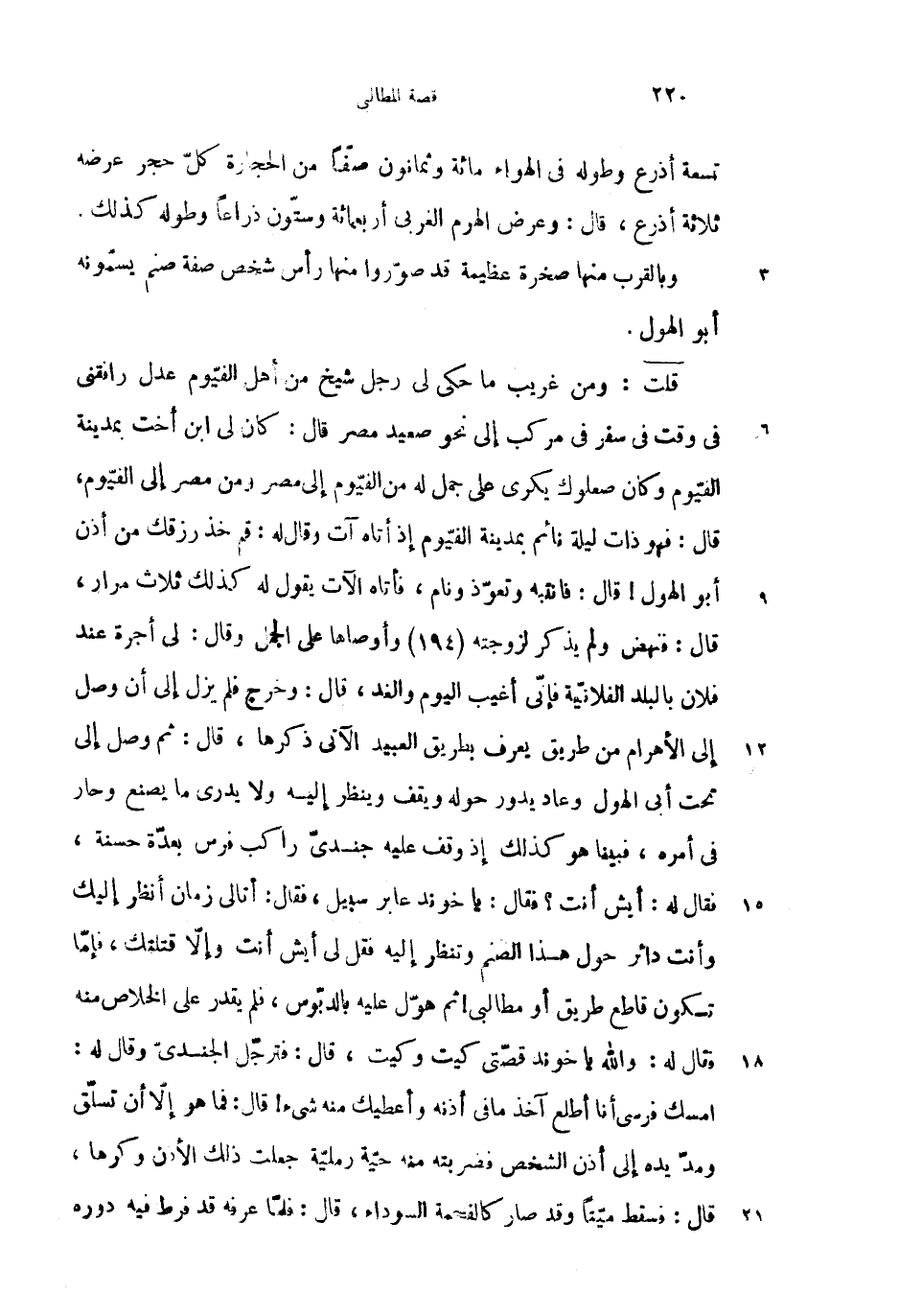 قلت: ومن غريب ما حكى لى رجل شيخ من أهل الفيّوم عدل رافقنى فى وقت فى سفر فى مركب إلى نحو صعيد مصر قال: كان لى ابن أخت بمدينة الفيّوم وكان صعلوك يكرى على جمل له من الفيّوم إلى مصر ومن مصر إلى الفيّوم، قال: فهو ذات ليلة نائم بمدينة الفيّوم إذا أتاه آت وقال له: قم خذ رزقك من أذن أبو الهول! قال: فانتبه وتعوّذ ونام، فأتاه الآت يقول له كذلك ثلاث مرار، قال: فنهض ولم يذكر لزوجته (194) وأوصاها على الجمل وقال: لى أجرة عند فلان بالبلد الفلانيّة فإنّى أغيب اليوم والغد، قال: وخرج فلم يزل إلى أن وصل إلى الأهرام من طريق يعرف بطريق العبيد الآتى ذكرها، قال: ثم وصل إلى تحت أبى الهول وعاد يدور حوله ويقف وينظر إليه ولا يدرى ما يصنع وحار فى أمره، فبينا هو كذلك إذ وقف عليه جندىّ راكب فرس بعدّة حسنة، فقال له: أيش أنت؟ فقال: يا خوند عابر سبيل، فقال: أتالى زمان أنظر إليك وأنت دائر حول هذا الصنم وتنظر إليه فقل لى أيش أنت وإلاّ قتلتك، فإمّا تكون قاطع طريق أو مطالبى! ثم هوّل عليه بالدبّوس، فلم يقدر على الخلاص منه فقال له: والله يا خوند قصّتى كيت وكيت، قال: فترجّل الجندىّ وقال له: