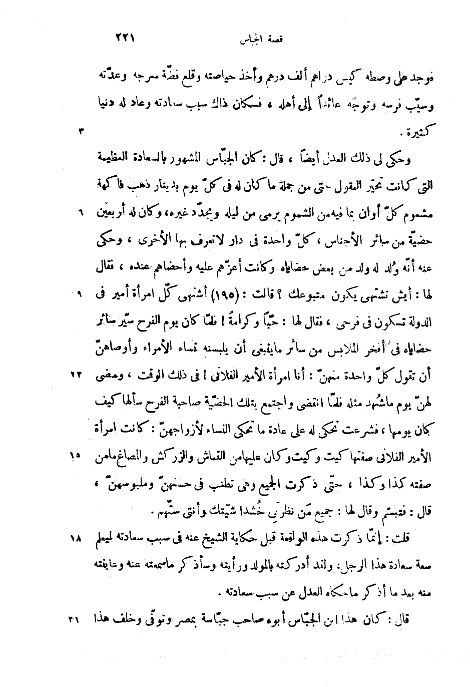 وحكى لى ذلك العدل أيضا، قال: كان الجبّاس المشهور بالسعادة العظيمة التى كانت تحيّر العقول حتى من جملة ما كان له فى كلّ يوم بدينار ذهب فاكهة مشموم كلّ أوان بما فيه من الشموم يرمى من ليله ويجدّد غيره، وكان له أربعين حضيّة من سائر الأجناس، كلّ واحدة فى دار لا تعرف بها الأخرى، وحكى عنه أنّه ولد له ولد من بعض حضاياه وكانت أعزّهم عليه وأحضاهم عنده، فقال لها: أيش تشتهى يكون متبوعك؟ قالت: (195) أشتهى كلّ امرأة أمير فى الدولة تكون فى فرحى، فقال لها: حبّا وكرامة! فلمّا كان يوم الفرح سيّر سائر حضاياه فى أفخر الملابس من سائر ما ينبغى أن يلبسنه نساء الأمراء وأوصاهنّ أن تقول كلّ واحدة منهنّ: أنا امرأة الأمير الفلانى! فى ذلك الوقت، ومضى لهنّ يوم ما شهد مثله فلمّا انقضى واجتمع بتلك الحضيّة صاحبة الفرح سألها كيف كان يومها، فشرعت تحكى له على عادة ما تحكى النساء لأزواجهنّ: كانت امرأة الأمير الفلانى صفتها كيت وكيت وكان عليها من القماش والزركش والمصاغ ما من صفته كذا وكذا، حتّى ذكرت الجميع وهى تطنب فى حسنهنّ وملبوسهنّ، قال: فتبسّم وقال لها: جميع من نظرتى خشدا شيّتك وأنتى ستّهم.