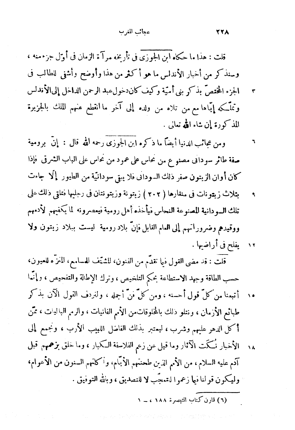 قلت: هذا ما حكاه ابن الجوزى فى تأريخه مرآة الزمان فى أوّل جزء منه، وسنذكر من أخبار الأندلس ما هو أكثر من هذا وأوضح وأشفى للطالب فى الجزء المختصّ بذكر بنى أميّة وكيف كان دخول عبد الرحمن الداخل إلى الأندلس وتملّكه إيّاها مع من تلاه من ولده إلى آخر ما انقطع عنهم الملك بالجزيرة المذكورة إن شاء الله تعالى.