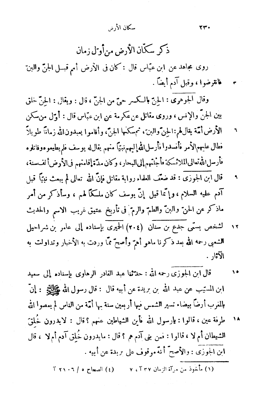 وقال الجوهرى: (2) الحنّ بالكسر حىّ من الجنّ، قال: ويقال: الحنّ خلق بين الجنّ والإنس، وروى مقاتل عن عكرمة عن ابن عبّاس قال: أوّل من سكن الأرض أمّة يقال لهم: الحنّ والبنّ، ثم سكنها الجنّ، وأقاموا يعبدون الله زمانا طويلا فطال عليهم الأمر فأفسدوا فأرسل الله إليهم نبيّا منهم يقال له يوسف فلم يطيعوه وقاتلوه فأرسل الله تعالى الملائكة فأجلتهم إلى البحار، وكان مدّة إقامتهم فى الأرض ألف سنة، قال ابن الجوزى: قد ضعّف العلماء رواية مقاتل فإنّ الله تعالى لم يبعث نبيّا قبل آدم عليه السلام، وإنّما قيل إنّ يوسف كان ملكا لهم، وسأذكر من أمر ما ذكر عن الحنّ والبنّ والطمّ والرمّ فى تأريخ عتيق غريب الاسم والحديث لشخص يسمّى جدع بن سنان (204) الحميرى بإسناده إلى عامر بن شراحيل الشعبى رحمه الله بعد ذكرنا ما هو أهمّ وأصحّ ممّا وردت به الأخبار وتداولت به الآثار.