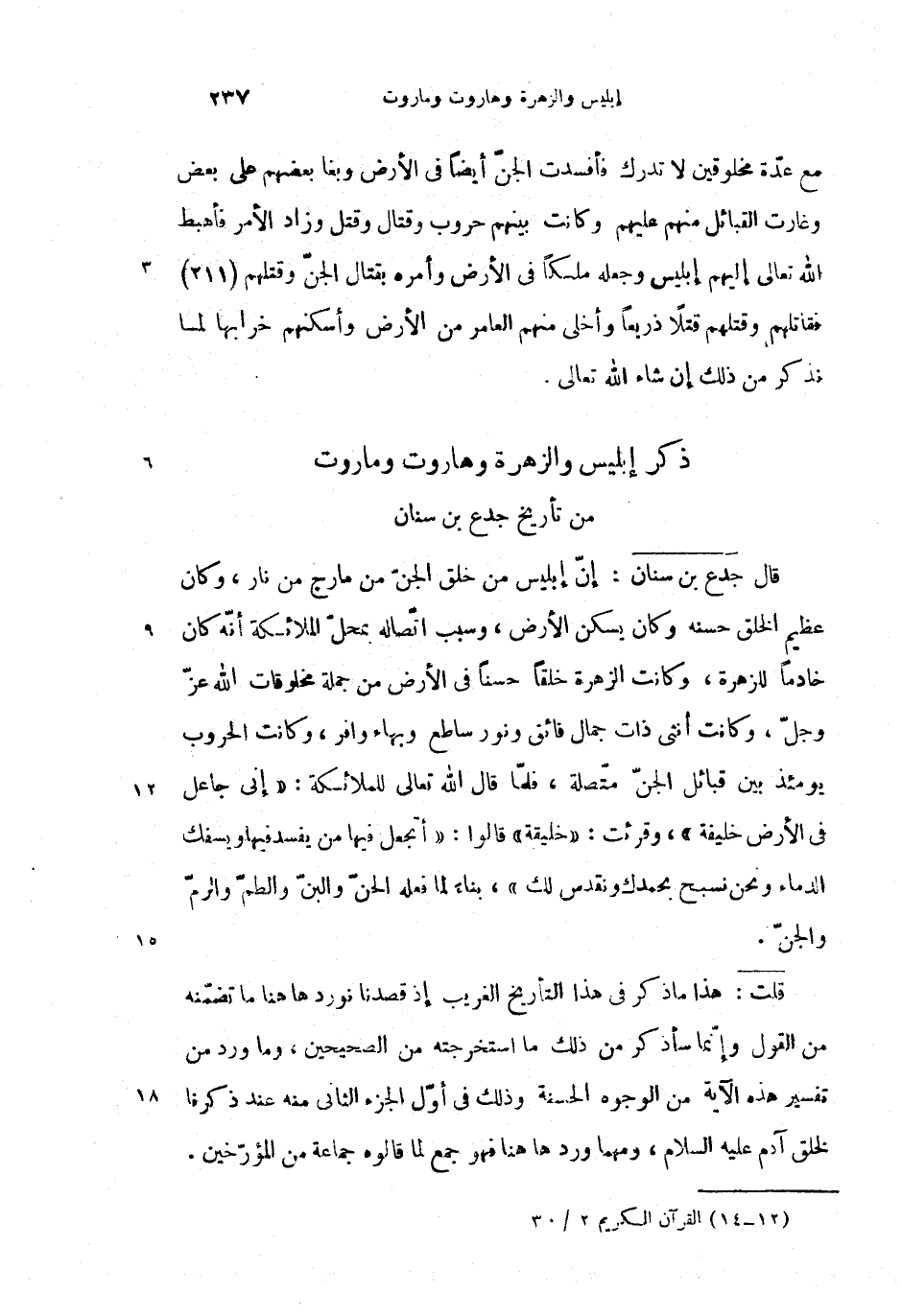 مع عدّة مخلوقين لا تدرك فأفسدت الجنّ أيضا فى الأرض وبغا بعضهم على بعض وغارت القبائل منهم عليهم وكانت بينهم حروب وقتال وقتل وزاد الأمر فأهبط الله تعالى إليهم إبليس وجعله ملكا فى الأرض وأمره بقتال الجنّ وقتلهم (211) فقاتلهم وقتلهم قتلا ذريعا وأخلى منهم العامر من الأرض وأسكنهم خرابها لما نذكر من ذلك إن شاء الله تعالى.