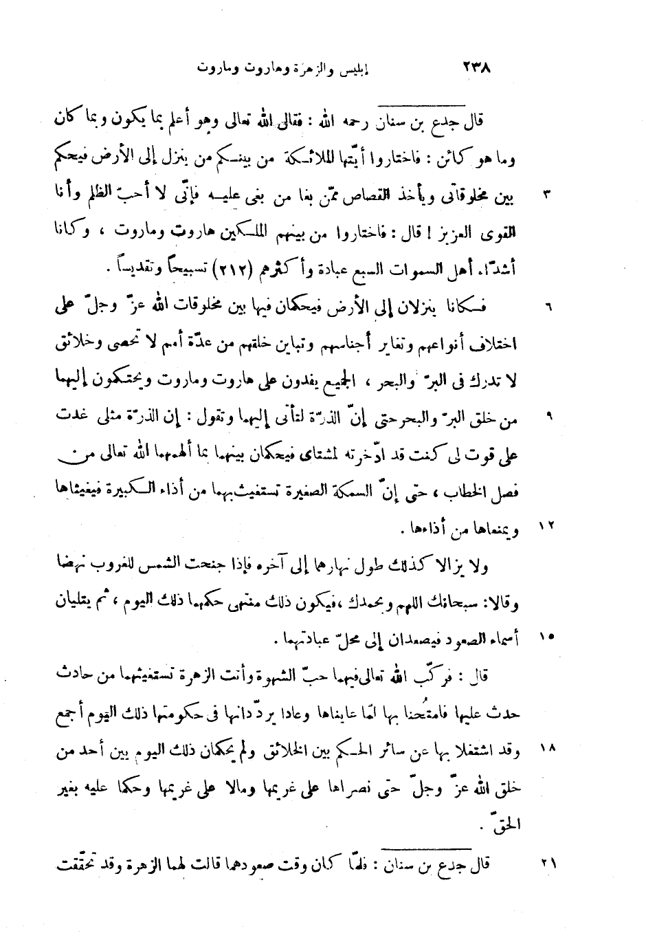 قال: فركّب الله تعالى فيهما حبّ الشهوة وأتت الزهرة تستغيثهما من حادث حدث عليها فامتحنا بها لمّا عايناها وعادا يردّدانها فى حكومتها ذلك اليوم أجمع وقد اشتغلا بها عن سائر الحكم بين الخلائق ولم يحكمان ذلك اليوم بين أحد من خلق الله عزّ وجلّ حتى نصراها على غريمها ومالا على غريمها وحكما عليه بغير الحقّ.