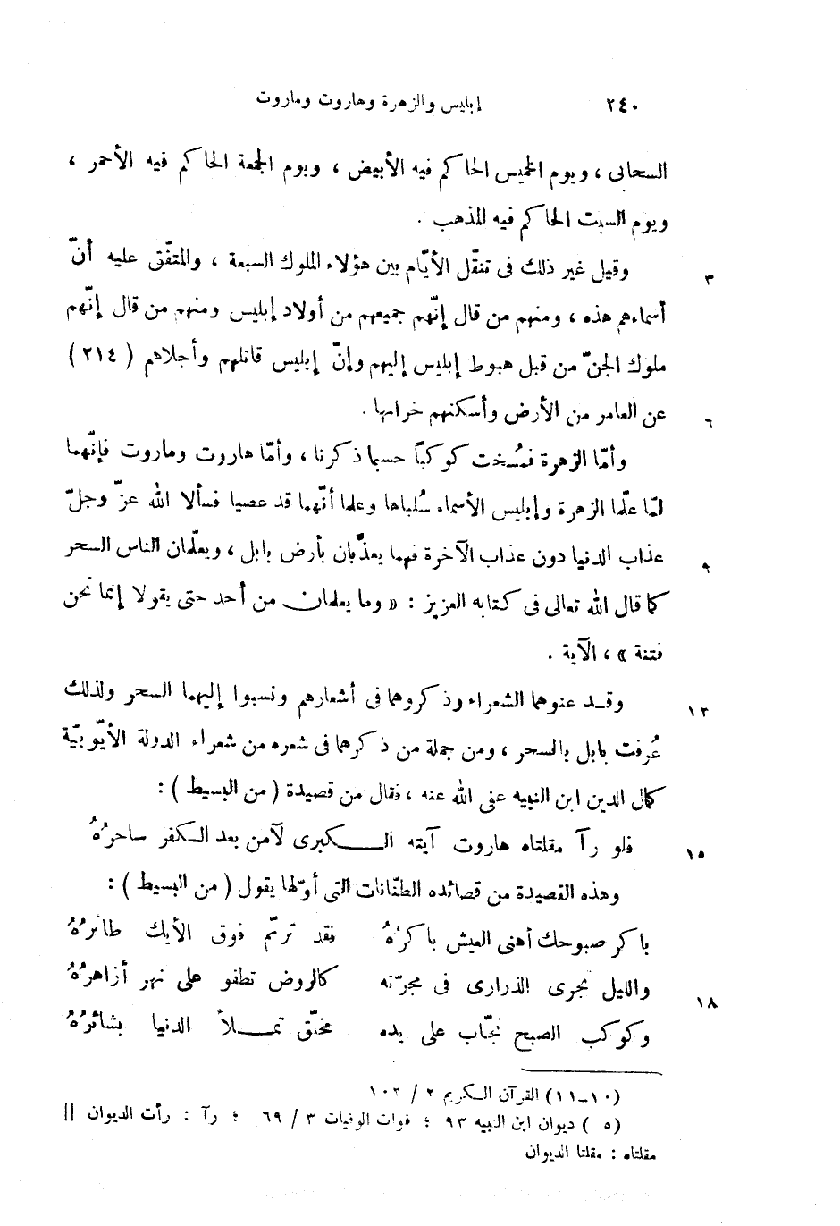 وأمّا الزهرة فمسخت كوكبا حسبما ذكرنا، وأمّا هاروت وماروت فإنّهما لمّا علّما الزهرة وإبليس الأسماء سلباها وعلما أنّهما قد عصيا فسألا الله عزّ وجلّ عذاب الدنيا دون عذاب الآخرة فهما يعذّبان بأرض بابل، ويعلّمان الناس السحر كما قال الله تعالى فى كتابه العزيز: {وَما يُعَلِّمانِ مِنْ أَحَدٍ حَتّى يَقُولا إِنَّما نَحْنُ فِتْنَةٌ»} (1)، الآية.