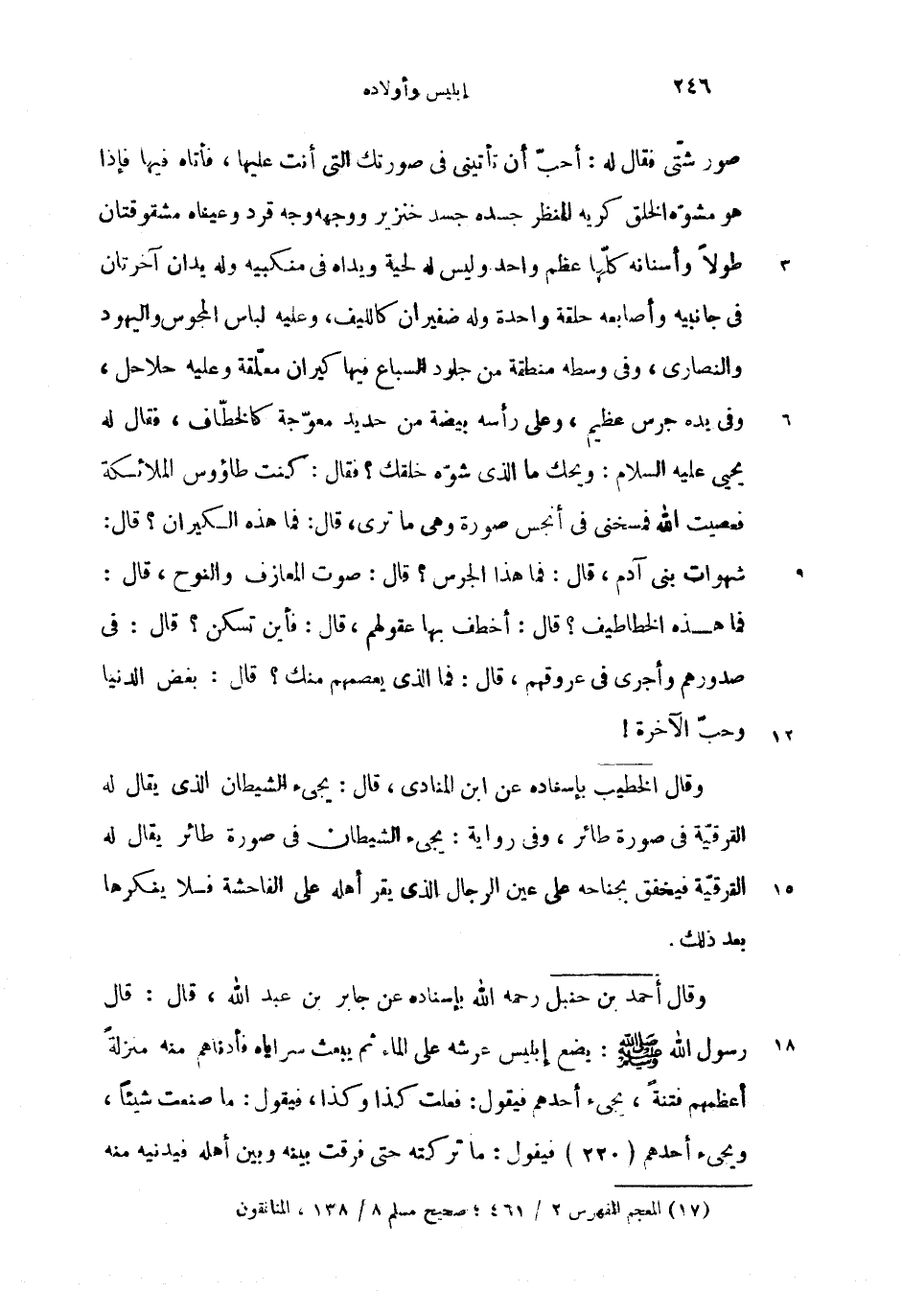 صور شتّى فقال له: أحبّ أن تأتينى فى صورتك التى أنت عليها، فأتاه فيها فإذا هو مشوّه الخلق كريه المنظر جسده جسد خنزير ووجهه وجه قرد وعيناه مشقوقتان طولا وأسنانه كلّها عظم واحد وليس له لحية ويداه فى منكبيه وله يدان آخرتان فى جانبيه وأصابعه حلقة واحدة وله ضفيران كالليف، وعليه لباس المجوس واليهود والنصارى، وفى وسطه منطقة من جلود السباع فيها كيران معلّقة وعليه حلاحل، وفى يده جرس عظيم، وعلى رأسه بيضة من حديد معوّجة كالخطّاف، فقال له يحيى عليه السلام: ويحك ما الذى شوّه خلقك؟ فقال: كنت طاؤوس الملائكة فعصيت الله فمسخنى فى أنجس صورة وهى ما ترى، قال: فما هذه الكيران؟ قال: