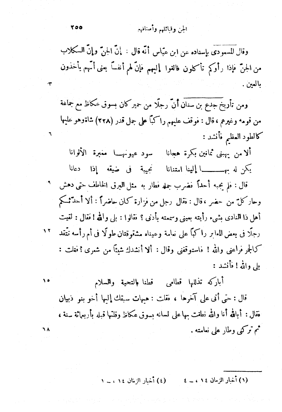 ومن تأريخ جدع بن سنان (2) أنّ رجلا من حمير كان بسوق عكاظ مع جماعة من قومه وغيرهم، قال: فوقف عليهم راكبا على جمل قدر (228) شاة وهو عليها كالطود العظيم فأنشد: