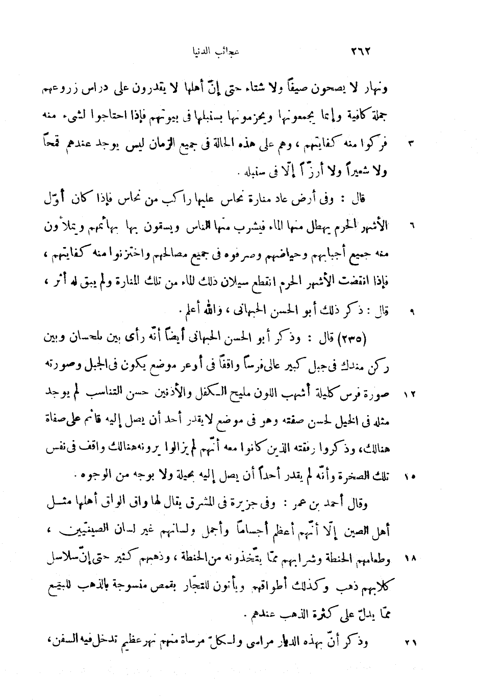 (235) قال: وذكر أبو الحسن الحبهانى أيضا أنّه رأى بين بلحسان وبين ركن مندك فى جبل كبير عالى فرسا واقفا فى أوعر موضع يكون فى الجبل وصورته صورة فرس كليلة أشهب اللون مليح الكفل والأذنين حسن التناسب لم يوجد مثله فى الخيل لحسن صفته وهو فى موضع لا يقدر أحد أن يصل إليه قائم على صفاة هنالك، وذكروا رفقته الذين كانوا معه أنّهم لم يزالوا يرونه هنالك واقف فى نفس تلك الصخرة وأنّه لم يقدر أحدا أن يصل إليه بحيلة ولا بوجه من الوجوه.