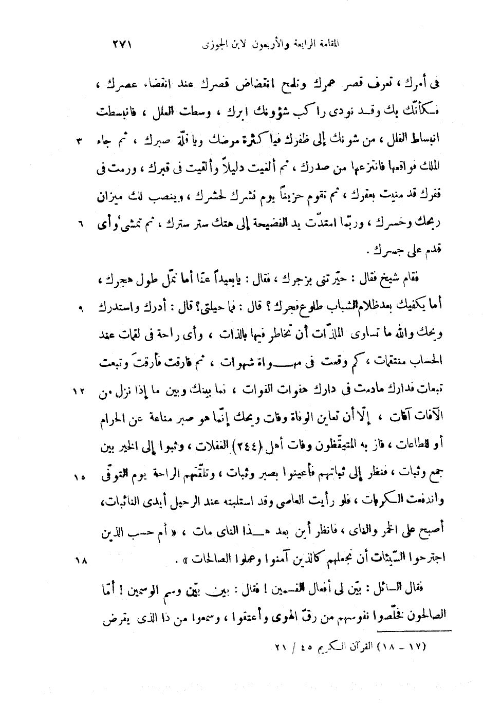 فقام شيخ فقال: حيّرتنى بزجرك، فقال: يا بعيدا عنّا أما تمّل طول هجرك، أما يكفيك بعد ظلام الشباب طلوع فجرك؟ قال: فما حيلتى؟ قال: أدرك واستدرك ويحك والله ما تساوى الملذّات أن تخاطر فيها باللذات، وأى راحة فى لقمات عند الحساب منتقمات، كم وقعت فى مهواة شهوات، ثم فارقت فأرقت وتبعت تبعات فدارك مادمت فى دارك هفوات الفوات، فما بينك وبين ما إذا نزل من الآفات آفات، إلاّ أن تعاين الوفاة وفات ويحك إنّما هو صبر مناعة عن الحرام أو للطاعات، فاز به المتيقّظون وفات أهل (244) الغفلات، وثبوا إلى الخير بين جمع وثبات، فنظر إلى ثباتهم فأعينوا بصبر وثبات، وتلقّتهم الراحة يوم التوفّى واندفعت الكربات، فلو رأيت العاصى وقد استلبته عند الرحيل أيدى النائبات، أصبح على الخمر والناى، فانظر أين بعد هذا النادى مات، {أَمْ حَسِبَ الَّذِينَ اِجْتَرَحُوا السَّيِّئاتِ أَنْ نَجْعَلَهُمْ كَالَّذِينَ آمَنُوا وَعَمِلُوا الصّالِحاتِ»} (1).