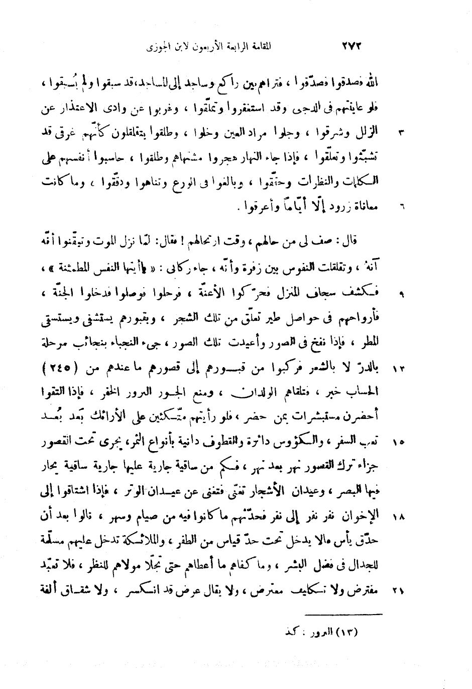 الله فصدّقوا فصدّقوا، فتراهم بين راكع وساجد إلى المساجد، قد سبقوا ولم يسبقوا، فلو عاينتهم فى الدجى وقد استغفروا وتملّقوا، وغربوا عن وادى الاعتذار عن الزلل وشرقوا، وجلوا مراد العين وخلوا، وطلقوا يتقلقلون كأنّهم غرقى قد تشبّثوا وتعلّقوا، فإذا جاء النهار هجروا مشتهاهم وطلقوا، حاسبوا أنفسهم على الكلمات والنظرات وحقّقوا، وبالغوا فى الورع وتناهوا ودقّقوا، وما كانت معاناة زرود إلاّ أيّاما وأعرقوا.