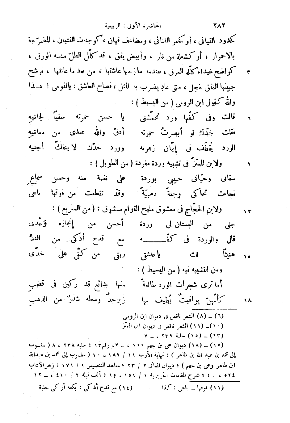 كحدود القيانى، أو كخمر القناتى، ومضاعف قيان، كوجنات الفتيان، المضرّجة بالاحمرار، أو كشعلة من نار، وأبيض يقق، قد كلّل الطلّ منه الورق، كواضح غيداء كلّله العرق، عند ما مازحها عاشقها، من بعد ما عانقها، فرشح جبينها اليقق خجل، حتى عاد يضرب به المثل، فصاح العاشق: يا لقومى! هذا والله كقول ابن الرومى (من البسيط): (1)
