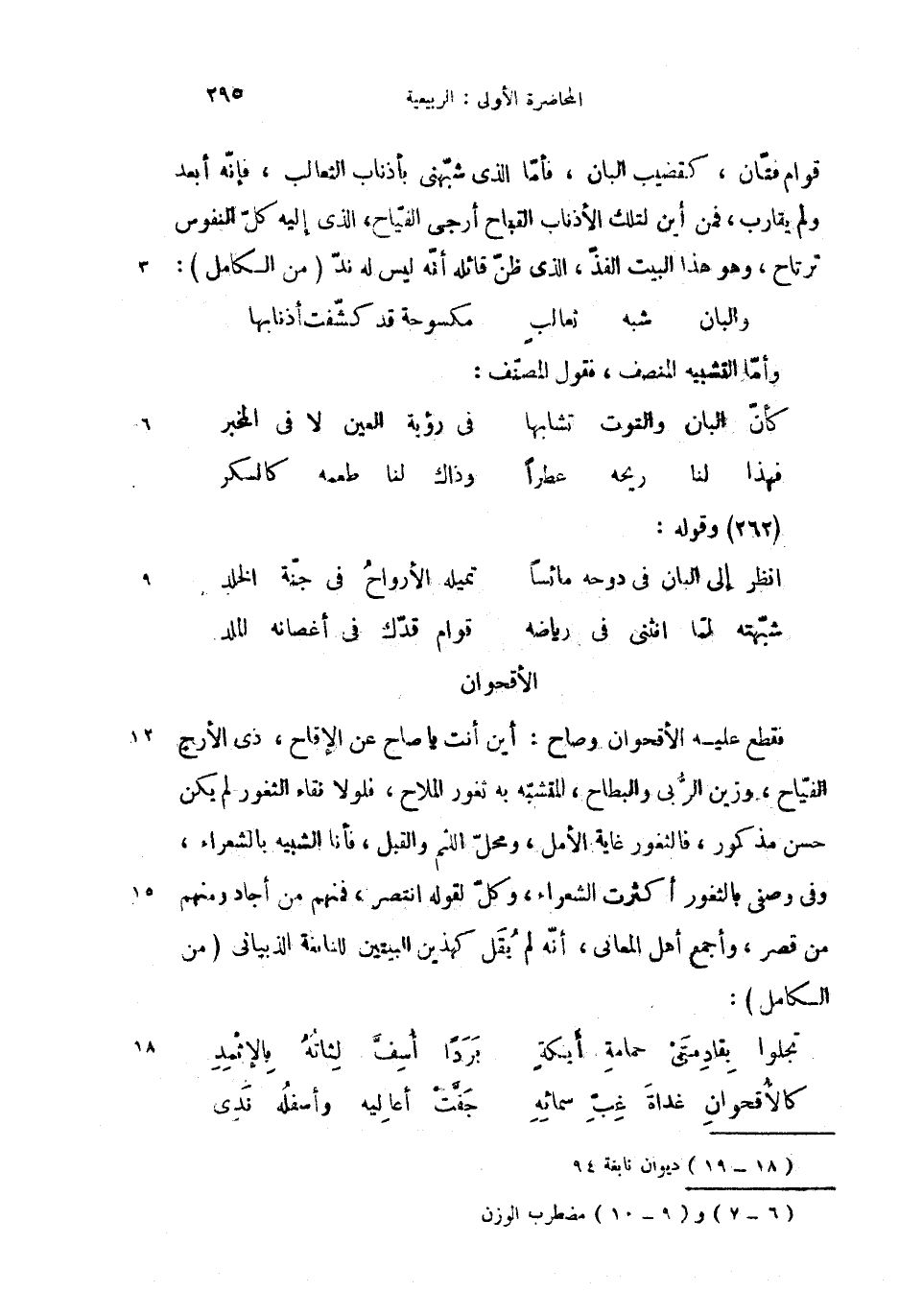 فقطع عليه الأقحوان وصاح: أين أنت يا صاح عن الإقاح، ذى الأرج الفيّاح، وزين الرّبى والبطاح، المتشبّه به ثغور الملاح، فلولا نقاء الثغور لم يكن حسن مذكور، فالثغور غاية الأمل، ومحلّ اللثم والقبل، فأنا التشبيه بالشعراء، وفى وصفى بالثغو أكثرت الشعراء، وكلّ لقوله انتصر، فمنهم من أجاد ومنهم من قصر، وأجمع أهل المعانى، أنّه لم يقل كهذين البيتين للنابغة الذبيانى (من الكامل): (1)