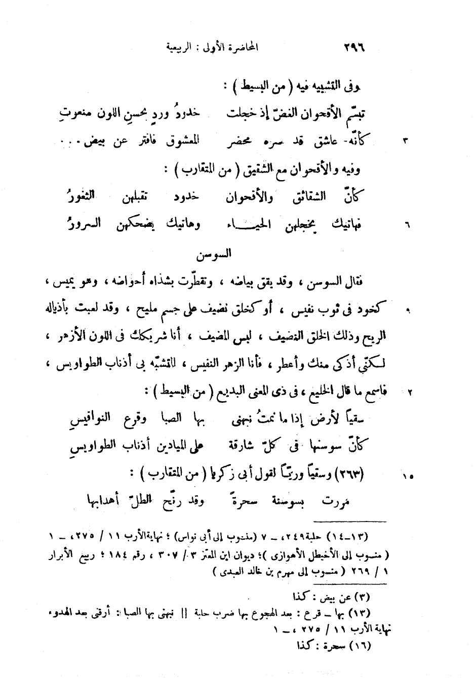 فقال السوسن، وقد يقق بياضه، وتقطّرت بشذاه أحواضه، وهو يميس، كخود فى ثوب نفيس، أو كخلق نضيف على جسم مليح، وقد لعبت بأذياله الريح وذلك الخلق النضيف، لبس المضيف، أنا شريكك فى اللون الأزهر، لكنّى أذكى منك وأعطر، فأنا الزهر النفيس، المتشبّه بى أذناب الطواويس، فاسمع ما قال الخليع، فى ذى المعنى البديع (من البسيط): (1)