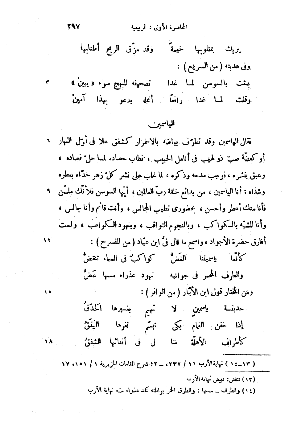 فقال الياسمين وقد تطرّف بياضه بالاحمرار كشفق علا فى أوّل النهار أو كعضّة صبّ ذو لهيب فى أنامل الحبيب، فطاب حصاده لما حلّ فصاده، وعبق بنشره، فوجب مدحه وذكره، لما غلب على نشر كلّ زهر خدّاه بعطره وشذاه: أنا الياسمين، من بدائع خلقة ربّ العالمين، أيّها السوسن فلأنّك ملسّن فأنا منك أعطر وأحسن، بحضورى تطيب المجالس، وأنت قائم وأنا جالس، وأنا المشبّه بالكواكب، وبالنجوم الثواقب، وبنهود الكواعب، ولست أفارق حضرة الأجواد، واسمع ما قال فىّ ابن عبّاد (من المنسرح): (1)