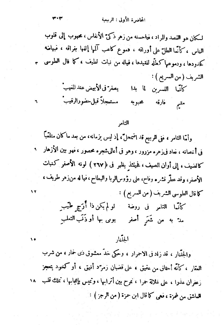لكان هو القصد والمراد، فياحسنه من زهر ذكىّ الأنفاس، محبوب إلى قلوب الناس، كأنّما الطلّ على أوراقه، دموع كاعب آلمها إلفها بفراقه، فبياضه كدودها، ودموعها كطلّة لفقيدها، فياله من نبات لطيف، كما قال الطوسى الشريف (من السريع):