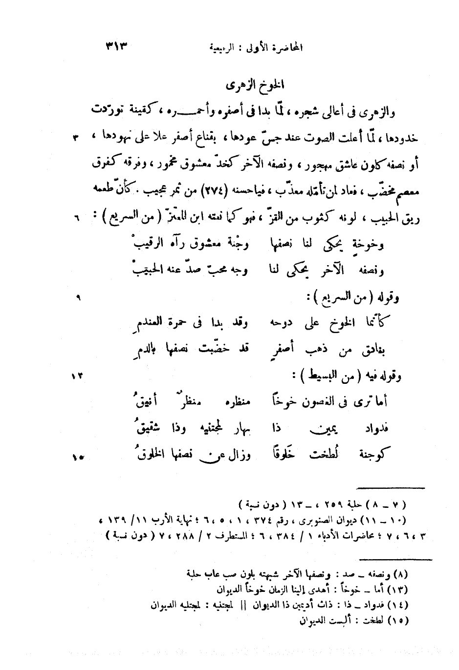 (2) ديوان الصنوبرى، رقم 374،1،5،6؛ نهاية الأرب 11/ 139، 3،6،7؛ محاضرات الأدباء 1/ 384،6؛ المستطرف 2/ 288،7 (دون نسبة)