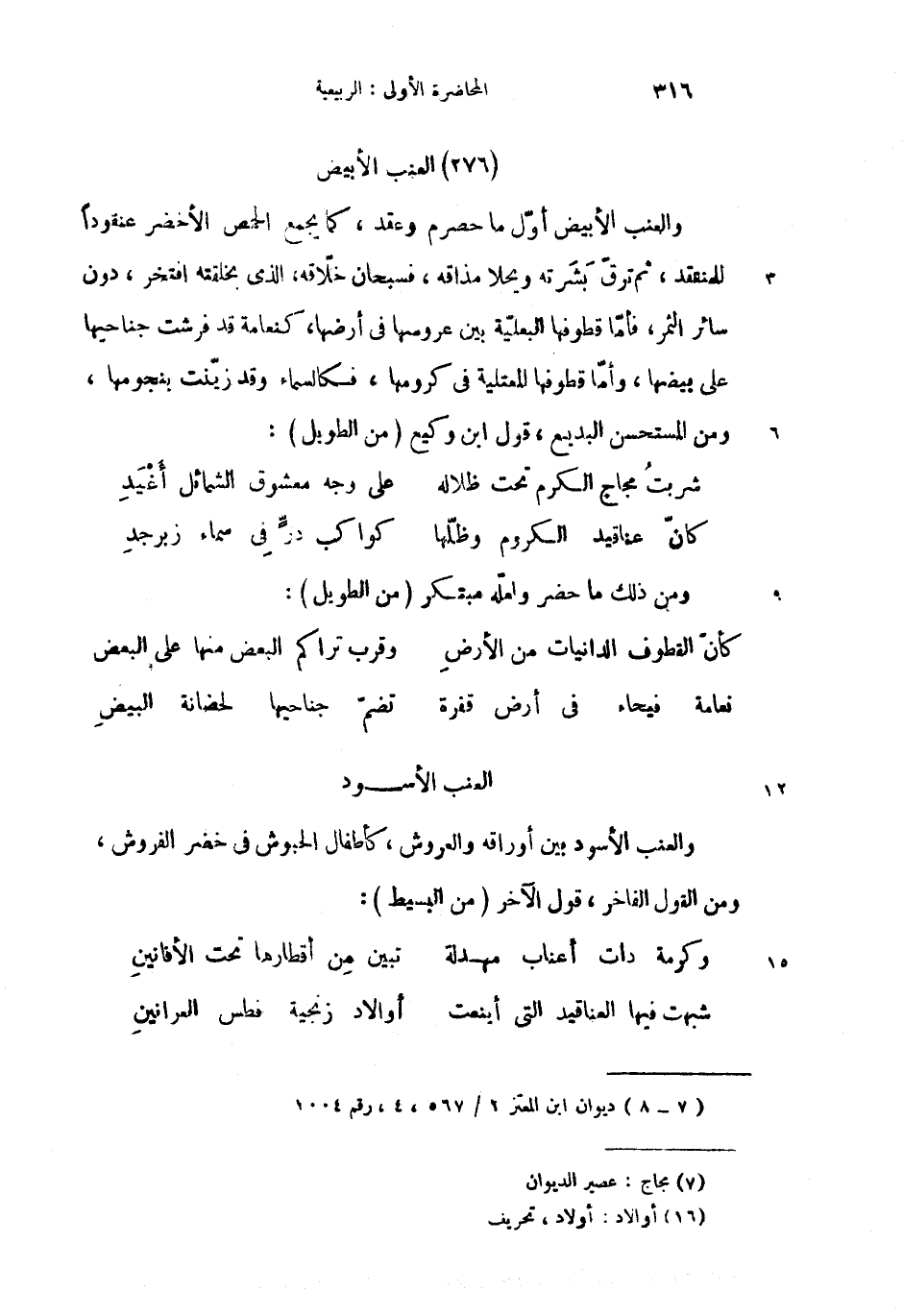 والعنب الأبيض أوّل ما حصرم وعقد، كما يجمع الحمص الأخضر عنقودا للمنتقد، ثم ترقّ بشرته ويحلا مذاقه، فسبحان خلاّقه، الذى بخلقته افتخر، دون سائر الثمر، فأمّا قطوفها البعليّة بين عروسها فى أرضها، كنعامة قد فرشت جناحيها على بيضها، وأمّا قطوفها المعتلية فى كرومها، فكالسماء وقد زيّنت بنجومها، ومن المستحسن البديع، قول ابن وكيع (من الطويل): (1)