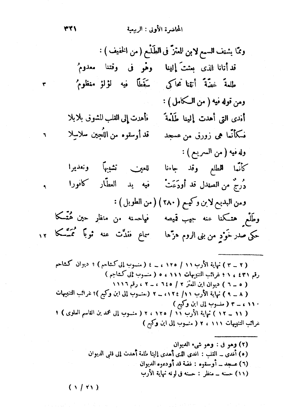 (1) نهاية الأرب 11/ 125، -4 (منسوب إلى كشاحم)؛ ديوان كشاحم رقم 431،1؛ غرائب التنبيهات 111،5 (منسوب إلى كشاجم)