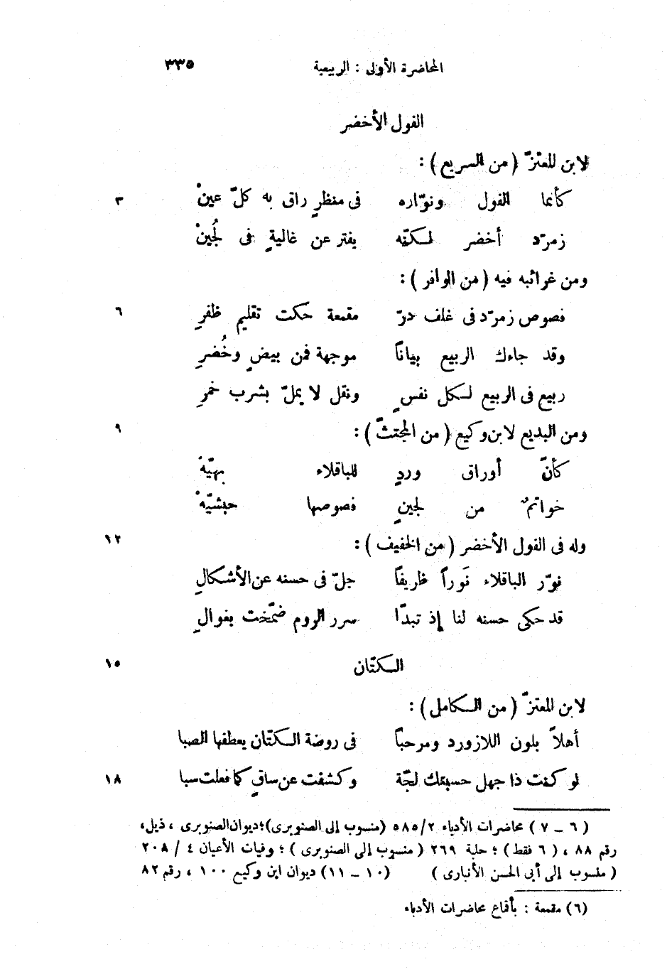 (1) محاضرات الأدباء 2/ 585 (منسوب إلى الصنوبرى)؛ ديوان الصنوبرى، ذيل، رقم 88، (6 فقط)؛ حلبة 269 (منسوب إلى الصنوبرى)؛ وفيات الأعيان 4/ 208 (منتسب إلى أبى الحسن الأنبارى)