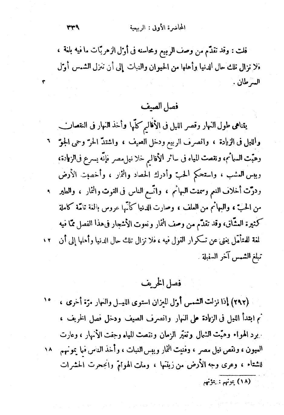 (292) إذا نزلت الشمس أوّل الميزان استوى الليل والنهار مرّة أخرى، ثم ابتدأ الليل فى الزيادة على النهار وانصرف الصيف ودخل فصل الخريف، وبرد الهواء وهبّت الشمال وتغيّر الزمان ونقصت المياه وجفت الأنهار، وعارت العيون، ونقص نيل مصر، وفنيت الثمار ويبس النبات، وأخذ الناس فيما يمونهم (1) للشتاء، وعرى وجه الأرض من زينتها، ومات الهوامّ وانجحرت الحشرات