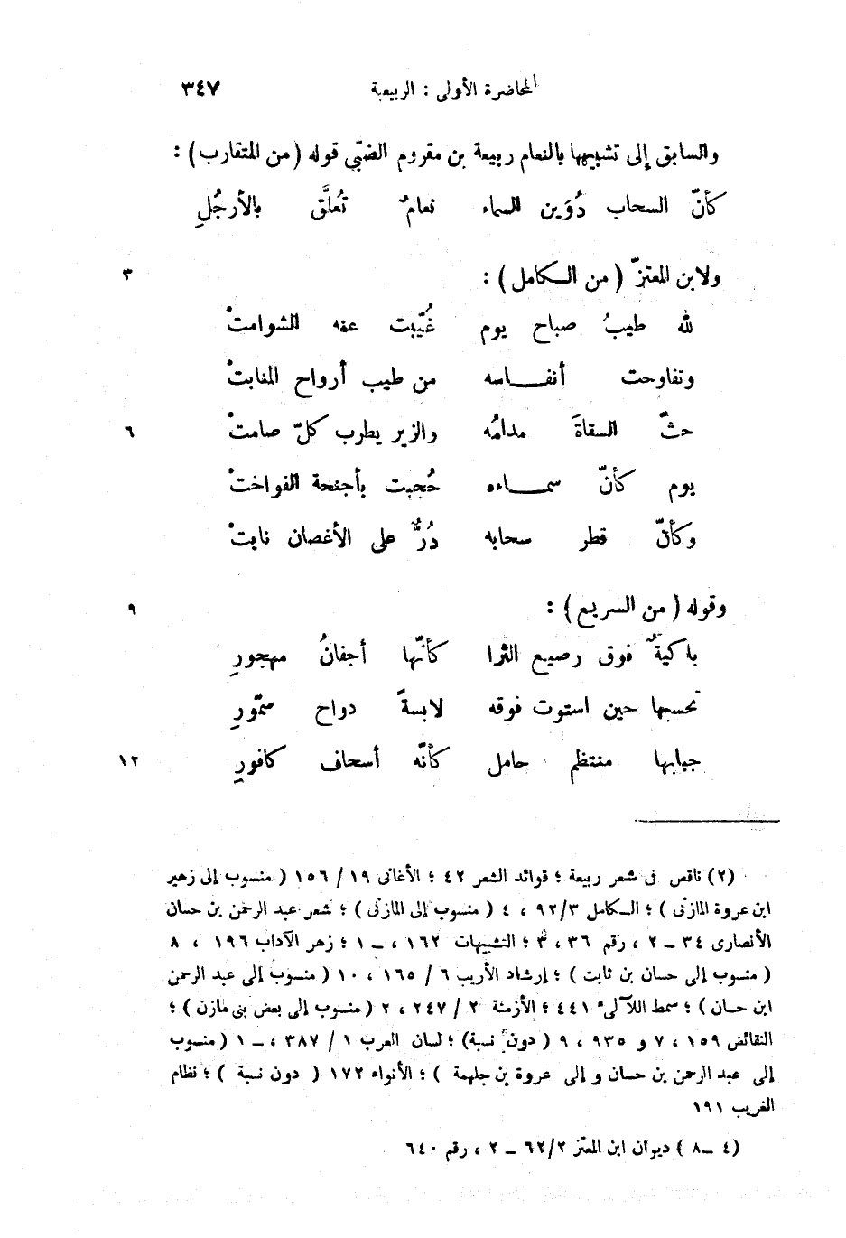 (1) ناقص فى شعر ربيعة؛ قوائد الشعر 42؛ الأغانى 19/ 156 (منسوب إلى زهير ابن عروة المازنى)؛ الكامل 3/ 92،4 (منسوب إلى المازنى)؛ شعر عبد الرحمن بن حسان الأنصارى 34 - 2، رقم 36،3؛ التشبيهات 162، -1؛ زهر الآداب 196،8 (منسوب إلى حسان بن ثابت)؛ إرشاد الأريب 6/ 165،10 (منسوب إلى عبد الرحمن ابن حسان)؛ سمط اللآلئ 441؛ الأزمنة 2/ 247،2 (منسوب إلى بعض بنى مازن)؛ النقائض 159،7 و 935،9 (دون نسبة)؛ لسان العرب 1/ 387، -1 (منسوب إلى عبد الرحمن بن حسان وإلى عروة بن جلهمة)؛ الأنواء 172 (دون نسبة)؛ نظام الغريب 191