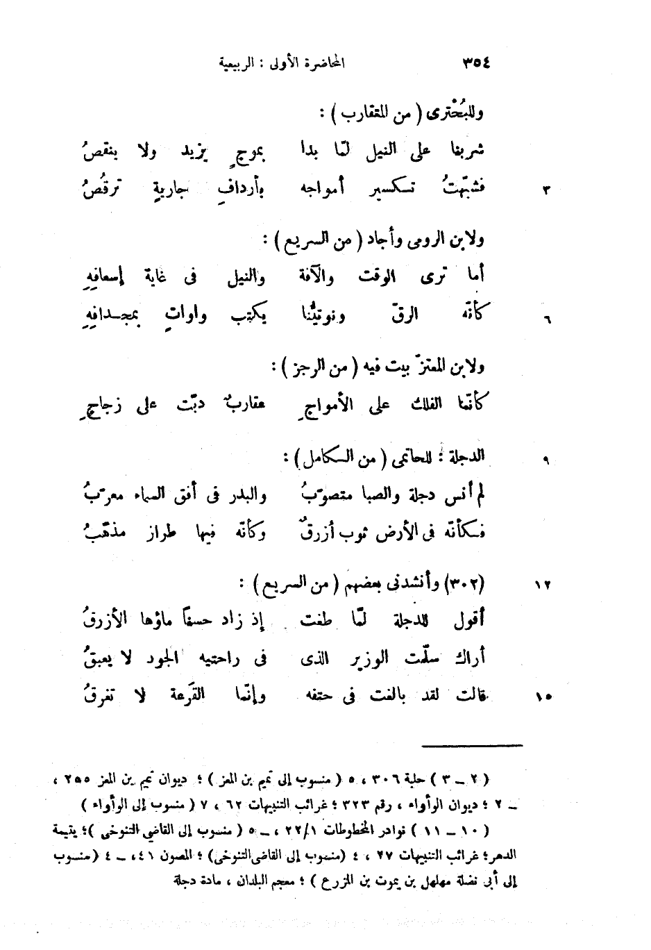 (2) نوادر المخطوطات 1/ 22، -5 (منسوب إلى القاضى التنوخى)؛ يتيمة الدهر؛ غرائب التنبيهات 27،4 (منسوب إلى القاضى التنوخى)؛ المصون 48، -4 (منسوب إلى أبى نضلة مهلهل بن يموت بن المزرع)؛ معجم البلدان، مادة دجلة
