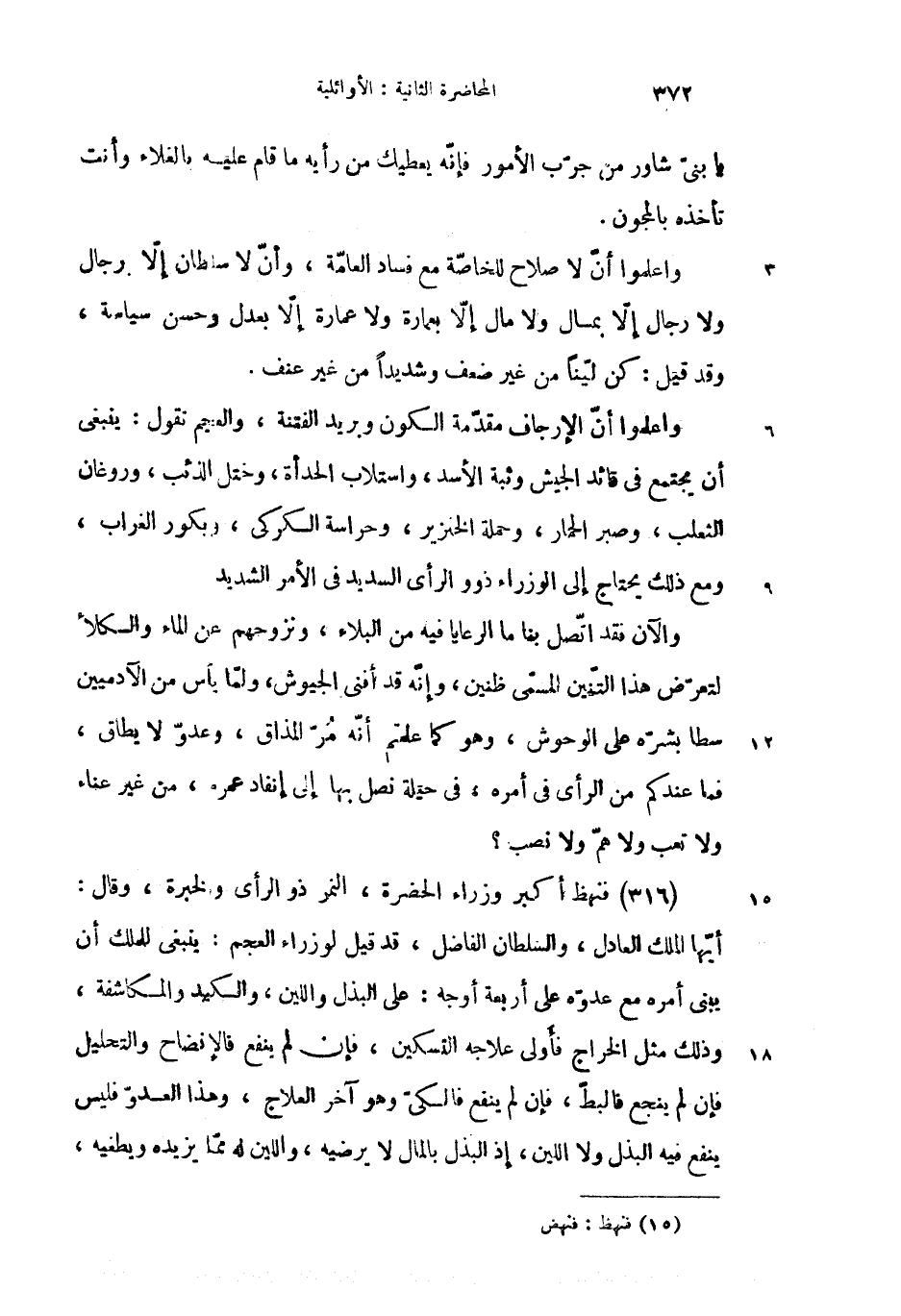 واعلموا أنّ الإرجاف مقدّمة الكون وبريد الفتنة، والعجم تقول: ينبغى أن يجتمع فى قائد الجيش وثبة الأسد، واستلاب الحدأة، وختل الذئب، وروغان الثعلب، وصبر الحمار، وحملة الخنزير، وحراسة الكركى، وبكور الغراب، ومع ذلك يحتاج إلى الوزراء ذو والرأى السديد فى الأمر الشديد