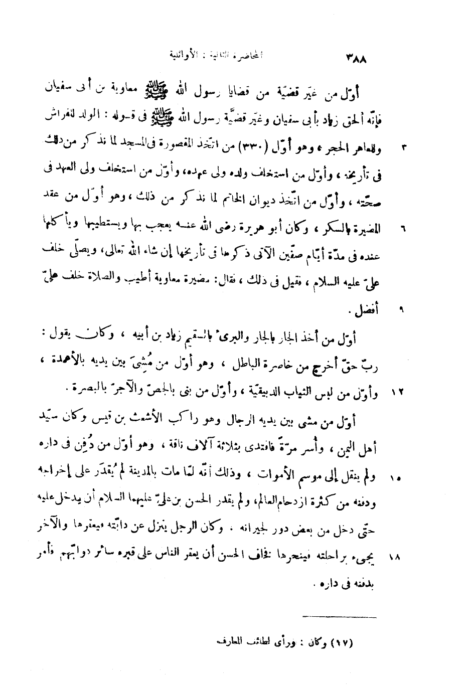 أوّل من غيّر قضيّة من قضايا رسول الله صلى الله عليه وسلم معاوية بن أبى سفيان فإنّه ألحق زياد بأبى سفيان وغيّر قضيّة رسول الله صلى الله عليه وسلم فى قوله: الولد للفراش وللعاهر الحجر، وهو أوّل (330) من اتّخذ المقصورة فى المسجد لما نذكر من ذلك فى تأريخه، وأوّل من استخلف ولده ولى عهده، وأوّل من استخلف ولى العهد فى صحّته، وأوّل من اتّخذ ديوان الخاتم لما نذكر من ذلك، وهو أوّل من عقد المغيرة بالسكر، وكان أبو هريرة رضى الله عنه يعجب بها ويستطيبها ويأكلها عنده فى مدّة أيّام صفّين الآتى ذكرها فى تأريخها إن شاء الله تعالى، ويصلّى خلف علىّ عليه السلام، فقيل فى ذلك، فقال: مضيرة معاوية أطيب والصلاة خلف علىّ أفضل.