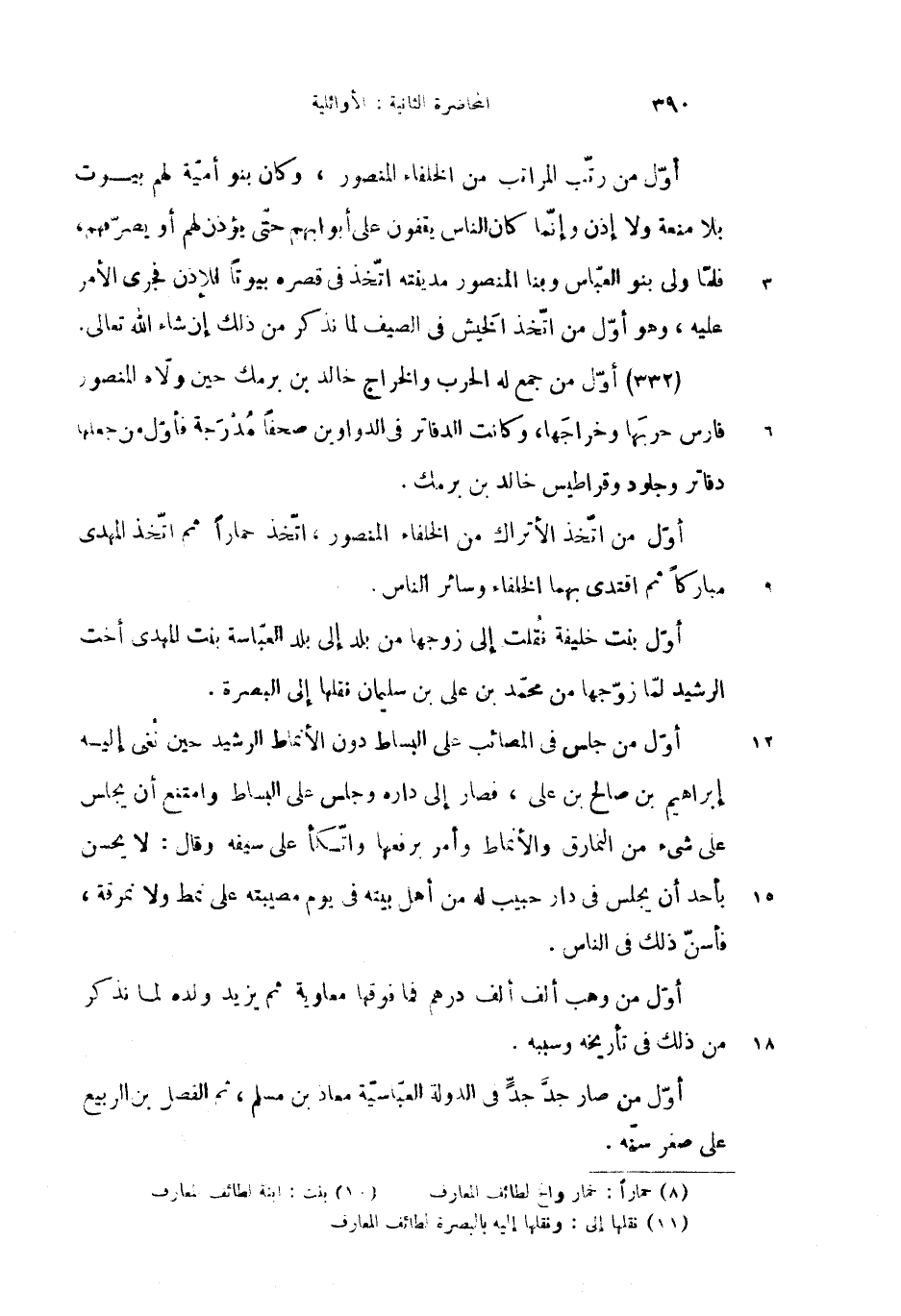 (332) أوّل من جمع له الحرب والخراج خالد بن برمك حين ولاّه المنصور فارس حربها وخراجها، وكانت الدفاتر فى الدواوين صحفا مدرجة فأوّل من جعلها دفاتر وجلود وقراطيس خالد بن برمك.