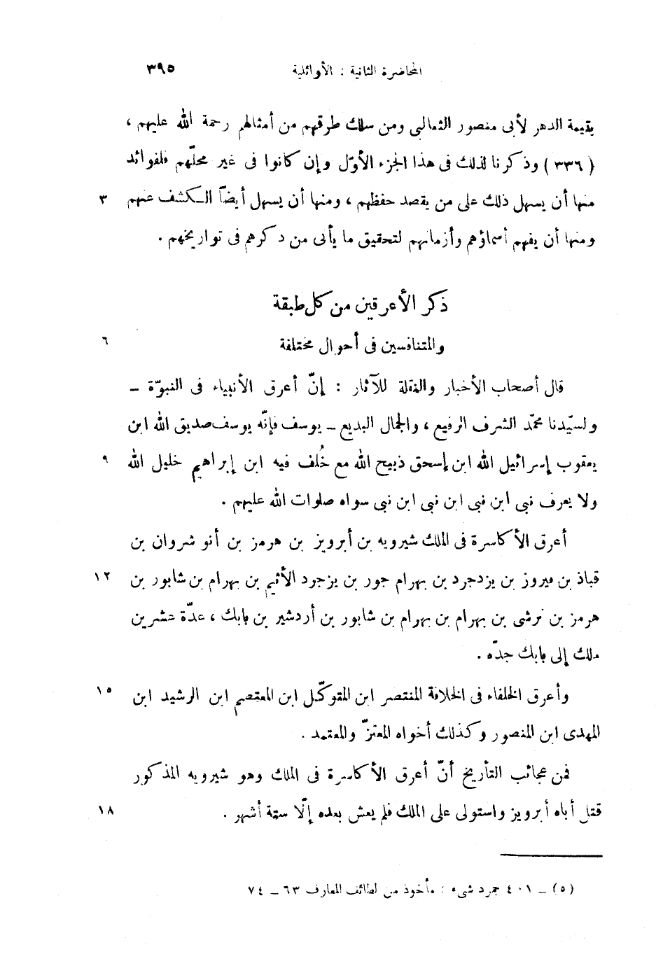 (1) قال أصحاب الأخبار والنقلة للآثار: إنّ أعرق الأنبياء فى النبوّة- ولسيّدنا محمّد الشرف الرفيع، والجمال البديع-يوسف فإنّه يوسف صديق الله ابن يعقوب إسرائيل الله ابن إسحق ذبيح الله مع خلف فيه ابن إبراهيم خليل الله ولا يعرف نبى ابن نبى ابن نبى سواه صلوات الله عليهم.