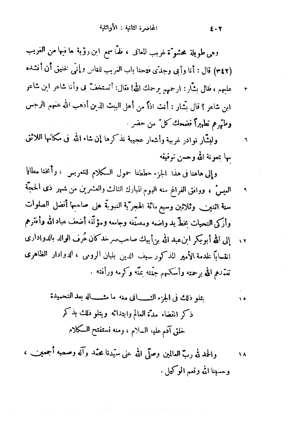 وإلى هاهنا فى هذا الجزء حططنا حمول الكلام للتعريس، وأنخنا مطايا العيس، ووافق الفراغ منه اليوم المبارك الثالث والعشرين من شهر ذى الحجّة سنة اثنين وثلاثين وسبع مائة الهجريّة النبويّة على صاحبها فضل الصلوات وأزكى التحيات بخطّ يد واضعه ومصنّفه وجامعه ومؤلّفه أضعف عباد الله وأفقرهم إلى الله أبو بكر ابن عبد الله بن أبيك صاحب صرخد كان عرف الوالد بالدوادارى انتسابا لخدمة الأمير المذكور سيف الدين بلبان الرومى، الدوادار الظاهرى تغمّدهم الله برحمته وأسكنهم جنّته بمنّه وكرمه ورأفته.