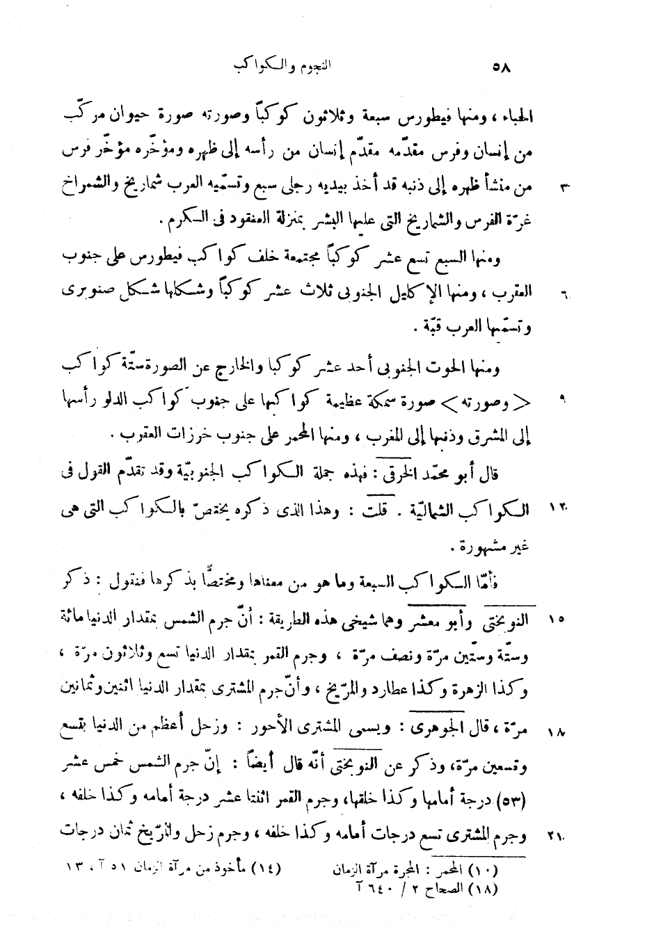 فأمّا الكواكب السبعة وما هو من معناها ومختصّا بذكرها فنقول: (2) ذكر النوبختى وأبو معشر وهما شيخى هذه الطريقة: أنّ جرم الشمس بمقدار الدنيا مائة وستّة وستّين مرّة ونصف مرّة، وجرم القمر بمقدار الدنيا تسع وثلاثون مرّة، وكذا الزهرة وكذا عطارد والمرّيخ، وأنّ جرم المشترى بمقدار الدنيا اثنين وثمانين مرّة، قال الجوهرى: (3) ويسمى المشترى الأحور: وزحل أعظم من الدنيا بتسع وتسعين مرّة، وذكر عن النوبختى أنّه قال أيضا: إنّ جرم الشمس خمس عشر (53) درجة أمامها وكذا خلقها، وجرم القمر اثنتا عشر درجة أمامه وكذا خلفه، وجرم المشترى تسع درجات أمامه وكذا خلفه، وجرم زحل والمرّيخ ثمان درجات