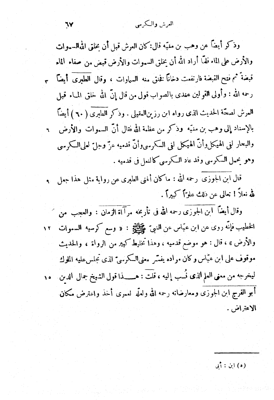 وقال أيضا ابن الجوزى رحمه الله فى تأريخه مرآة الزمان: والعجب من الخطيب فإنّه روى عن ابن عبّاس عن النبىّ صلى الله عليه وسلم: {وَسِعَ كُرْسِيُّهُ السَّماااتِ وَالْأَرْضَ»}، قال: هو موضع قدميه، وهذا تخليط كبير من الرواة، والحديث موقوف على ابن عبّاس وكان مراده يفسّر معنى الكرسىّ الذى تجلس عليه الملوك ليخرجه من معنى العلم الذى نسب إليه، قلت: هذا قول الشيخ جمال الدين أبو الفرج ابن الجوزى ومعارضاته رحمه الله ولعلّه لعمرى أخذ واعترض مكان الاعتراض.