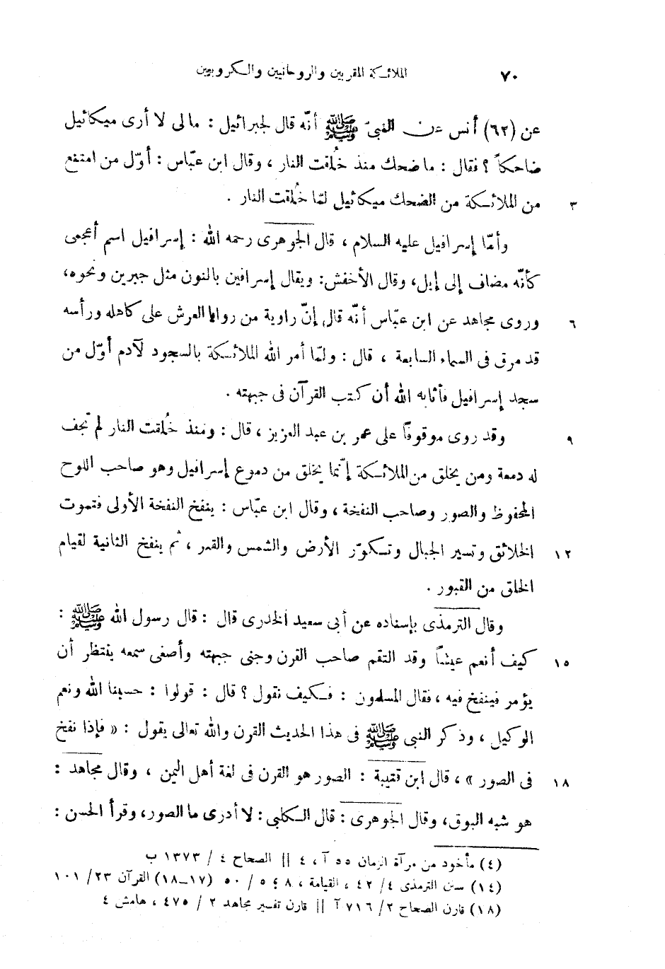 وقد روى موقوفا على عمر بن عبد العزيز، قال: ومنذ خلقت النار لم تجف له دمعة ومن يخلق من الملائكة إنّما يخلق من دموع إسرائيل وهو صاحب اللوح المحفوظ والصور وصاحب النفخة، وقال ابن عبّاس: ينفخ النفخة الأولى فتموت الخلائق وتسير الجبال وتكوّر الأرض والشمس والقمر، ثم ينفخ الثانية لقيام الخلق من القبور.