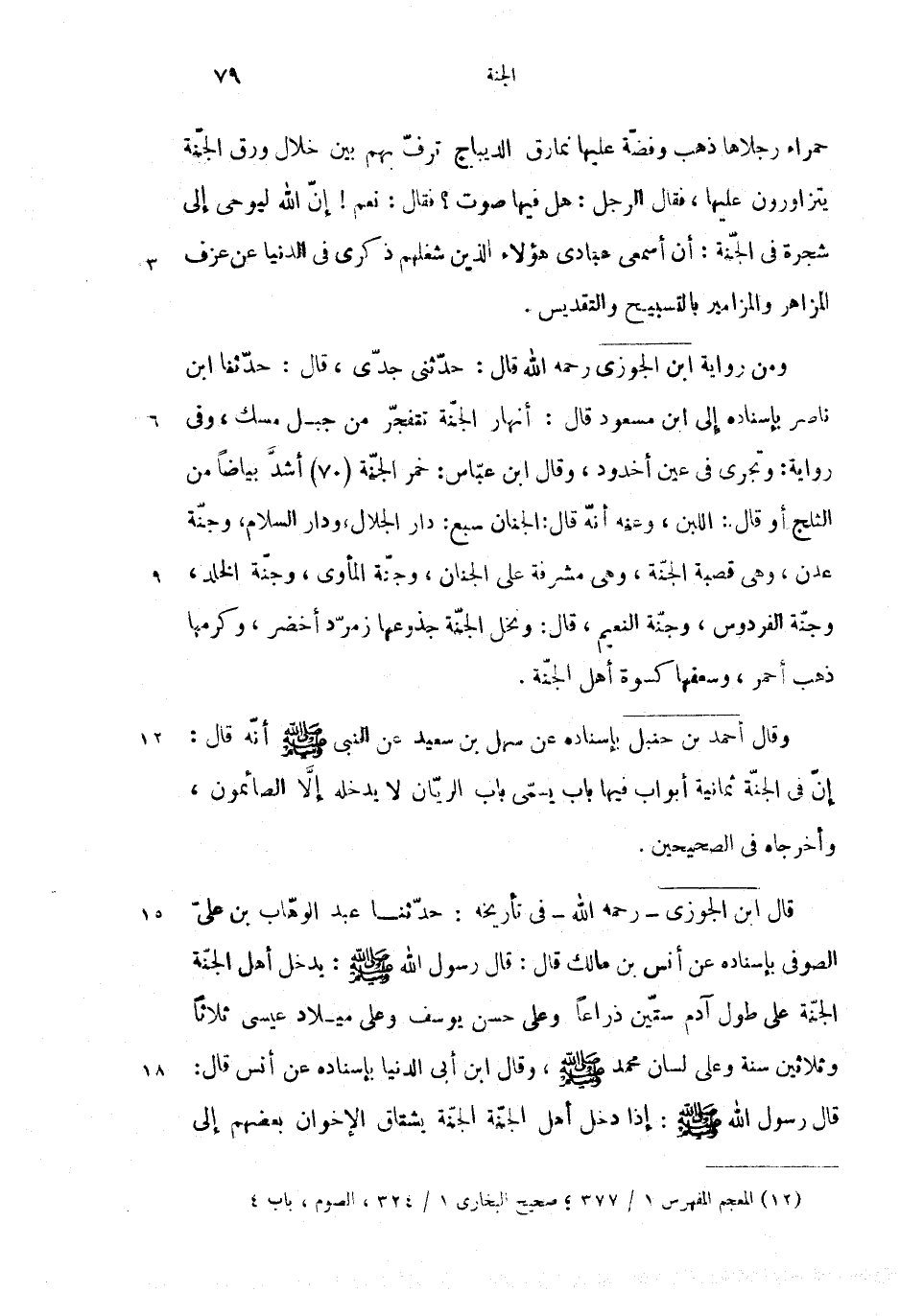 ومن رواية ابن الجوزى رحمه الله قال: حدّثنى جدّى، قال: حدّثنا ابن ناصر بإسناده إلى ابن مسعود قال: أنهار الجنّة تتفجّر من جبل مسك، وفى رواية: وتجرى فى عين أخدود، وقال ابن عبّاس: خمر الجنّة (70) أشدّ بياضا من الثلج أو قال: اللبن، وعنه أنّه قال: الجنان سبع: دار الجلال، ودار السلام، وجنّة عدن، وهى قصبة الجنّة، وهى مشرفة على الجنان، وجنّة المأوى، وجنّة الخلد، وجنّة الفردوس، وجنّة النعيم، قال: ونخل الجنّة جذوعها زمرّد أخضر، وكرمها ذهب أحمر، وسعفها كسوة أهل الجنّة.