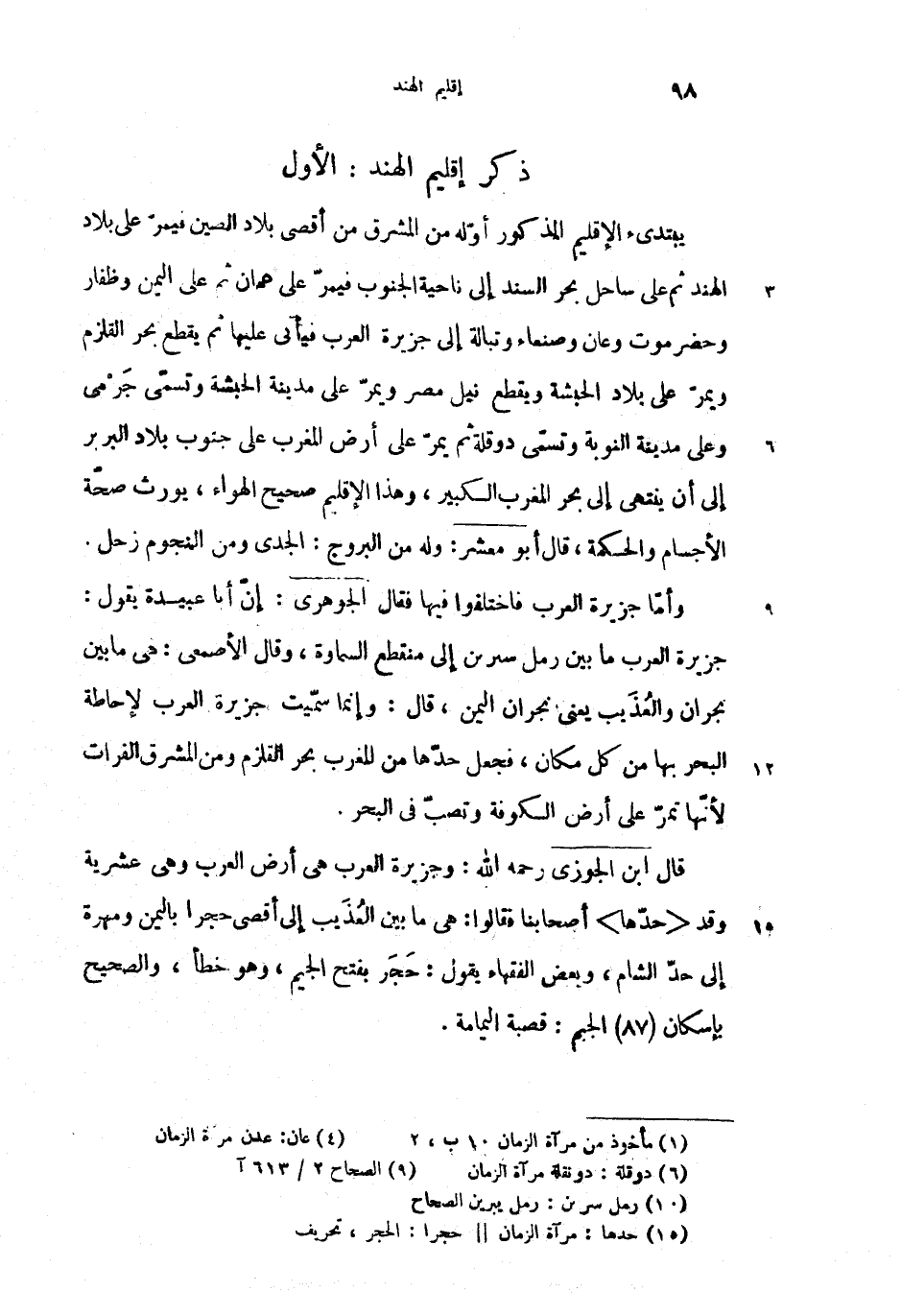 قال ابن الجوزى رحمه الله: وجزيرة العرب هى أرض العرب وهى عشرية وقد <حدّها> (6) أصحابنا فقالوا: هى ما بين العذيب إلى أقصى حجرا باليمن ومهرة إلى حدّ الشام، وبعض الفقهاء يقول: حجر بفتح الجيم، وهو حطأ، والصحيح بإسكان (87) الجيم: قصبة اليمامة.