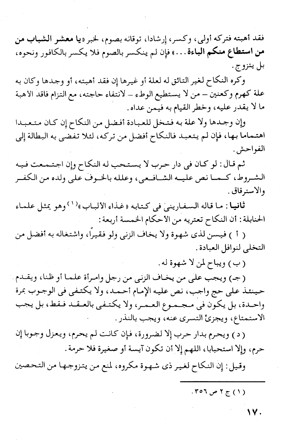 (أ) فيسن لذى شهوة ولا يخاف الزنى ولو فقيرا، واشتغاله به أفضل من
