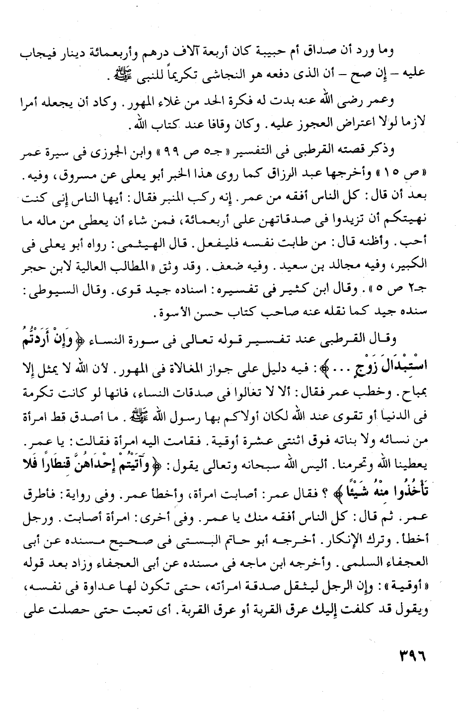 من نسائه ولا بناته فوق اثنتى عشرة أوقية. فقامت اليه امرأة فقالت: يا عمر.