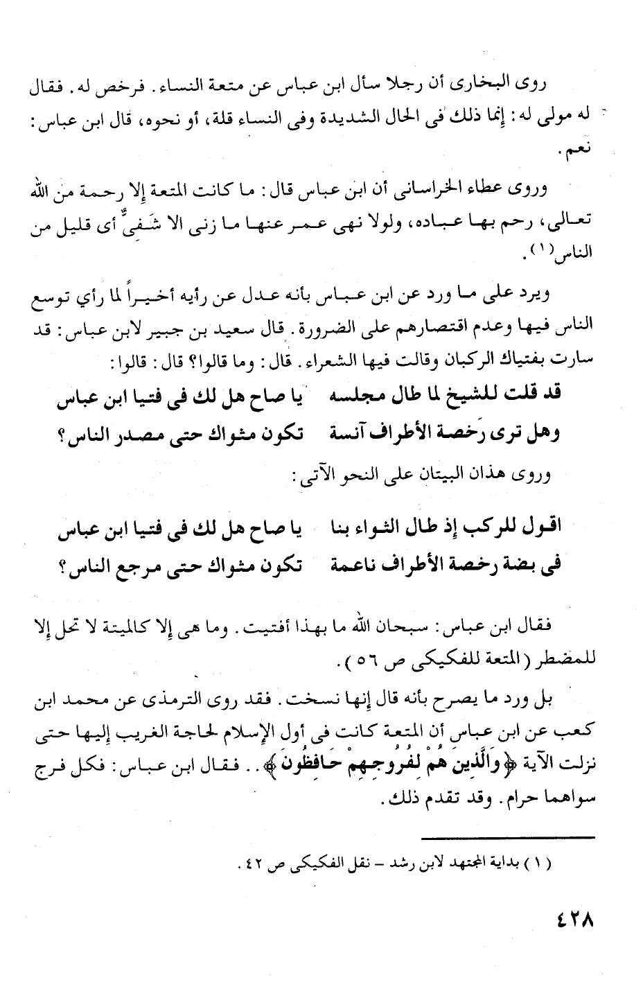 كعب عن ابن عباس أن المتعة كانت فى أول الإسلام لحاجة الغريب إليها حتى