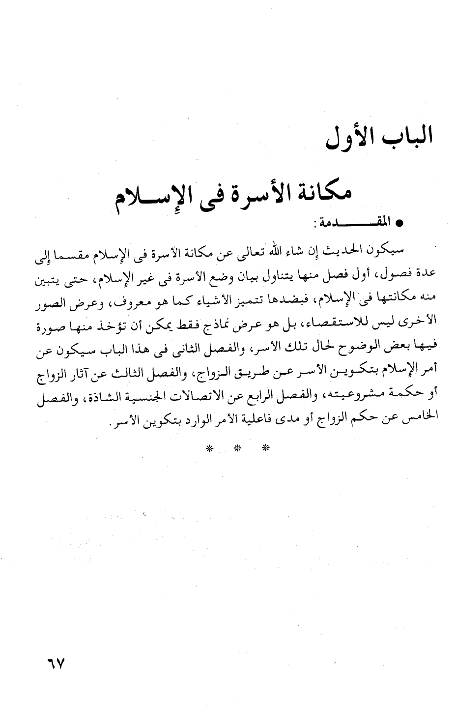 عدة فصول، أول فصل منها يشاول بيان وضع الأسرة فى غير الإسلام، حتى يتبين
