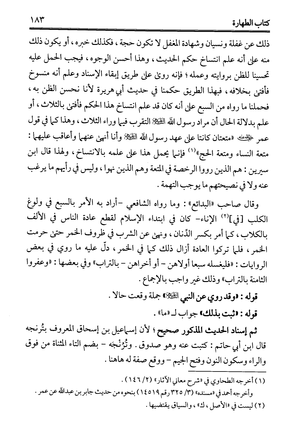 ذلك عن غفلة ونسيان وشهادة المغفل لا تكون حجة، فكذلك خبره، أو يكون ذلك منه على أنه علم انتساخ حكم الحديث، وهذا أحسن الوجوه، فيجب الحمل عليه تحسينا للظن بروايته وعمله؛ فإنه روى على طريق إبقاء الإسناد وعلم أنه منسوخ فأفتي بخلافه، فبهذا الطريق حكمنا في حديث أبي هريرة لأنا نحسن الظن به، فحملنا ما رواه من السبع على أنه كان قد علم انتساخ هذا الحكم فأفتي بالثلاث، أو علم بدلالة الحال أن مراد رسول الله - عليه السلام - التقرب فيما وراء الثلاث، وهذا كما في قول عمر - رضي الله عنه - "متعتان كانتا على عهد رسول الله - عليه السلام -وأنا أنهى عنهما وأعاقب عليهما: متعة النساء ومتعة الحج" (¬1) فإنما يحمل هذا على علمه بالانتساخ، ولهذا قال ابن سيرين: هم الذين رووا الرخصة في المتعة وهم الذين نهوا وليس في رأيهم ما يرغب عنه ولا في نصيحتهم ما يوجب التهمة.
